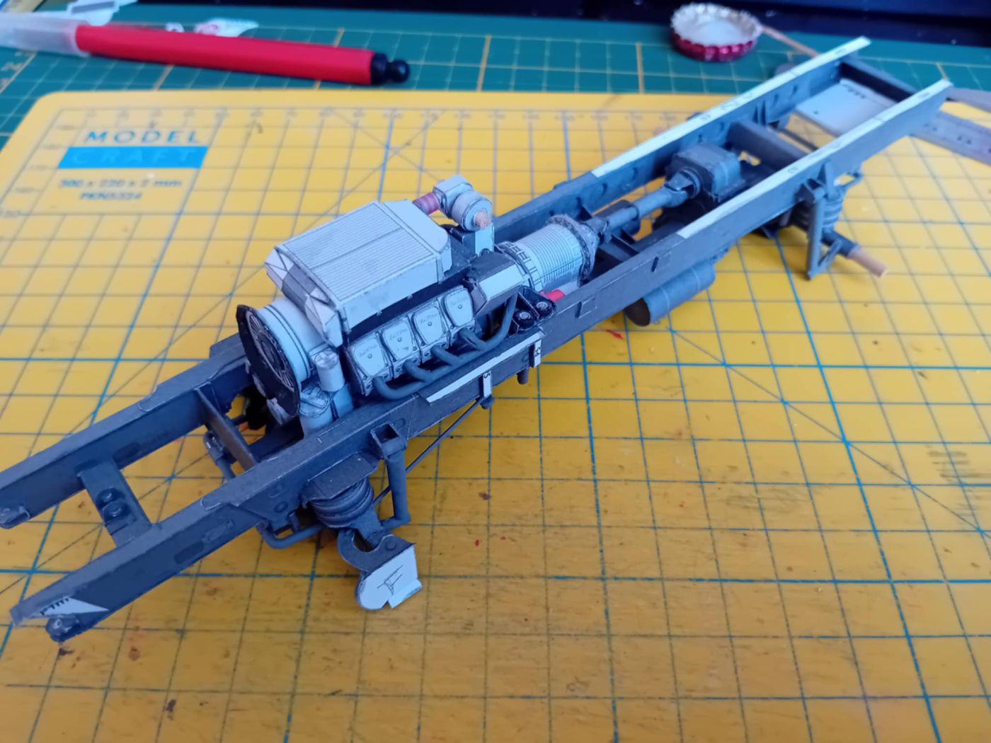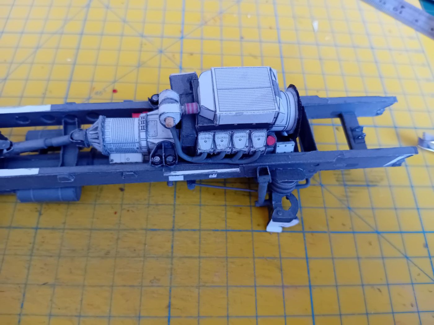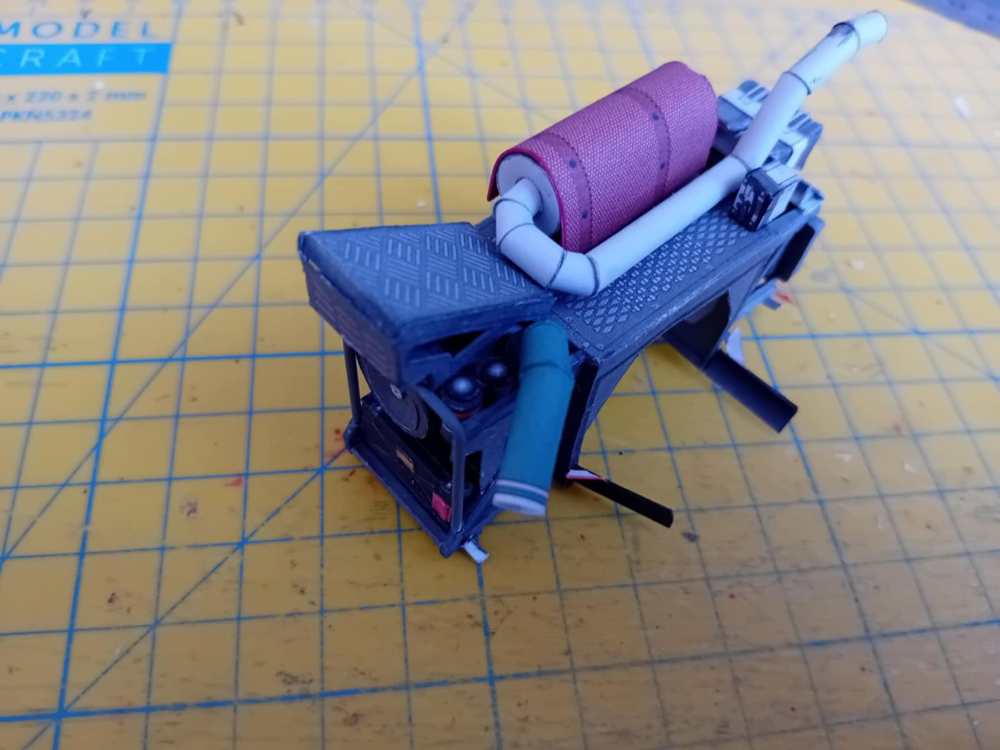 Na motore som miesto papierových zvodov urobil z drôtu. Všetko sa zatiaľ lepilo perfektne. Motor aj prevodovka sú pekne detailné. Na kryt motora by sa hodila použiť mriežka vypálená laserom, tú som nemal tak som ostal pri diely z vystrihovačky. Na ten prišli rôzne filtre, batérie, chladič, zakladacie kliny. Výfukové a sacie potrubie sa zatiaľ nepriliepa.