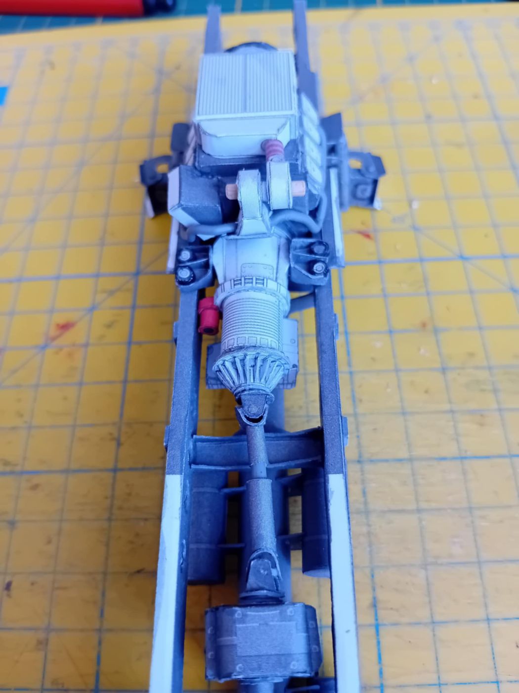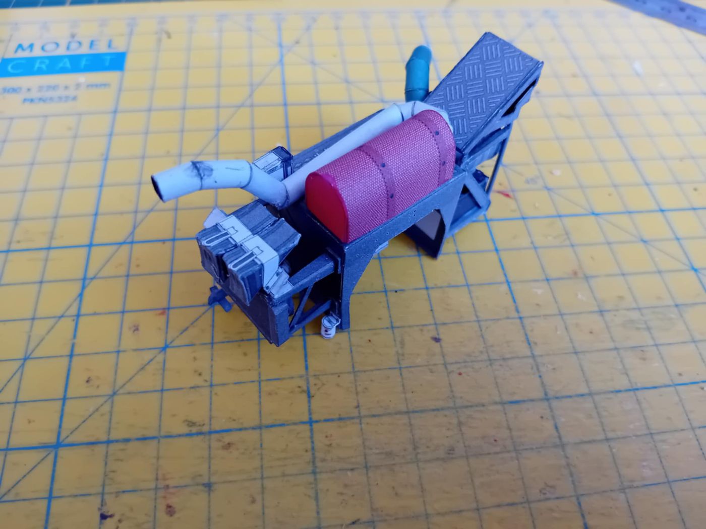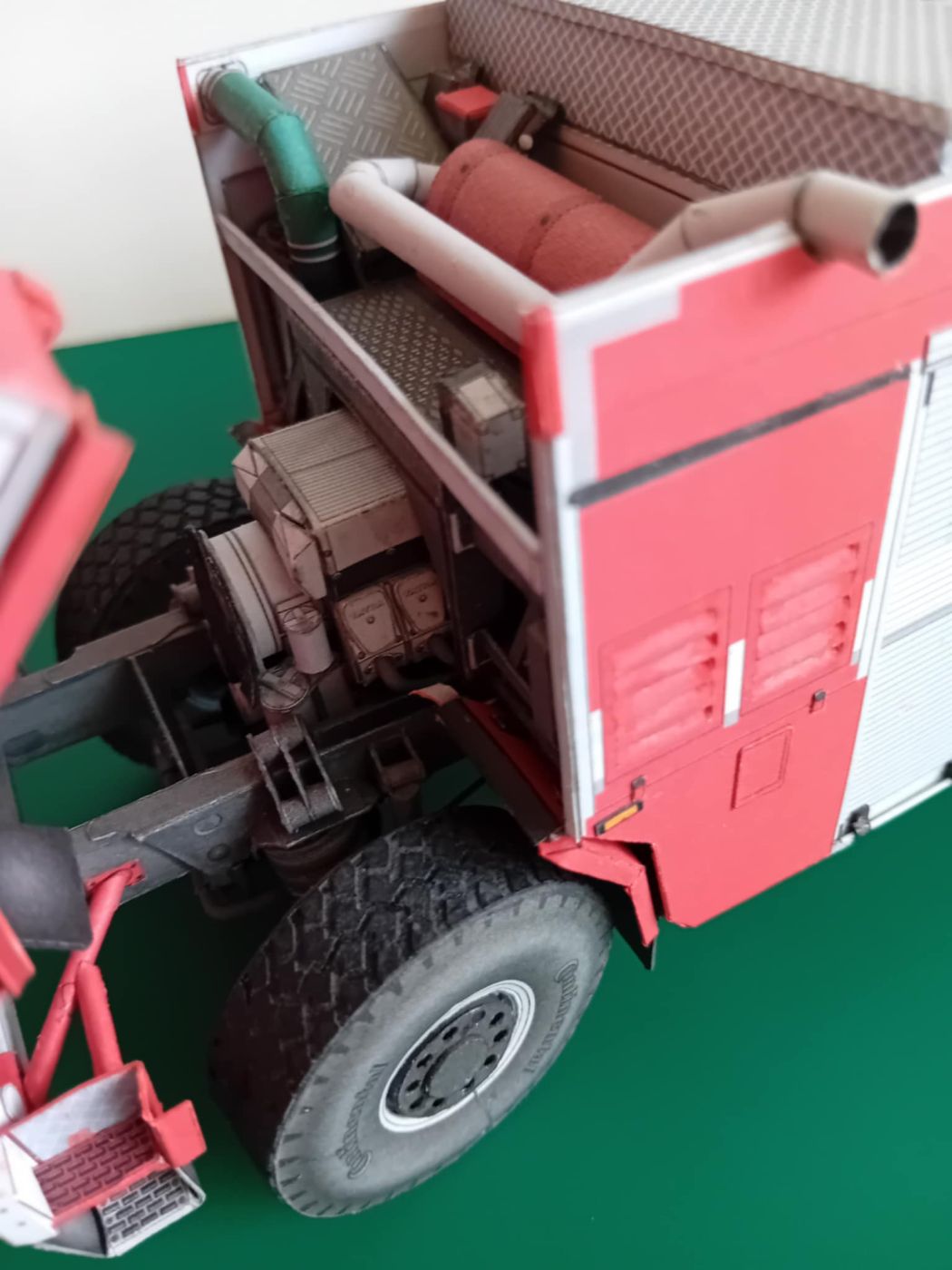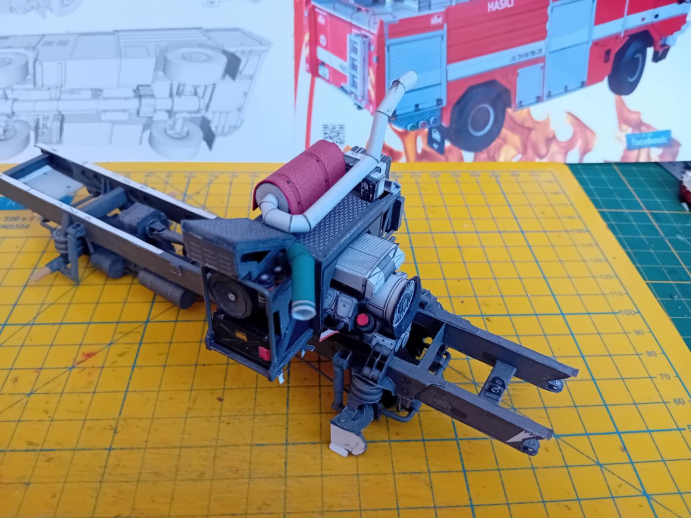 Na motore som miesto papierových zvodov urobil z drôtu. Všetko sa zatiaľ lepilo perfektne. Motor aj prevodovka sú pekne detailné. Na kryt motora by sa hodila použiť mriežka vypálená laserom, tú som nemal tak som ostal pri diely z vystrihovačky. Na ten prišli rôzne filtre, batérie, chladič, zakladacie kliny. Výfukové a sacie potrubie sa zatiaľ nepriliepa.