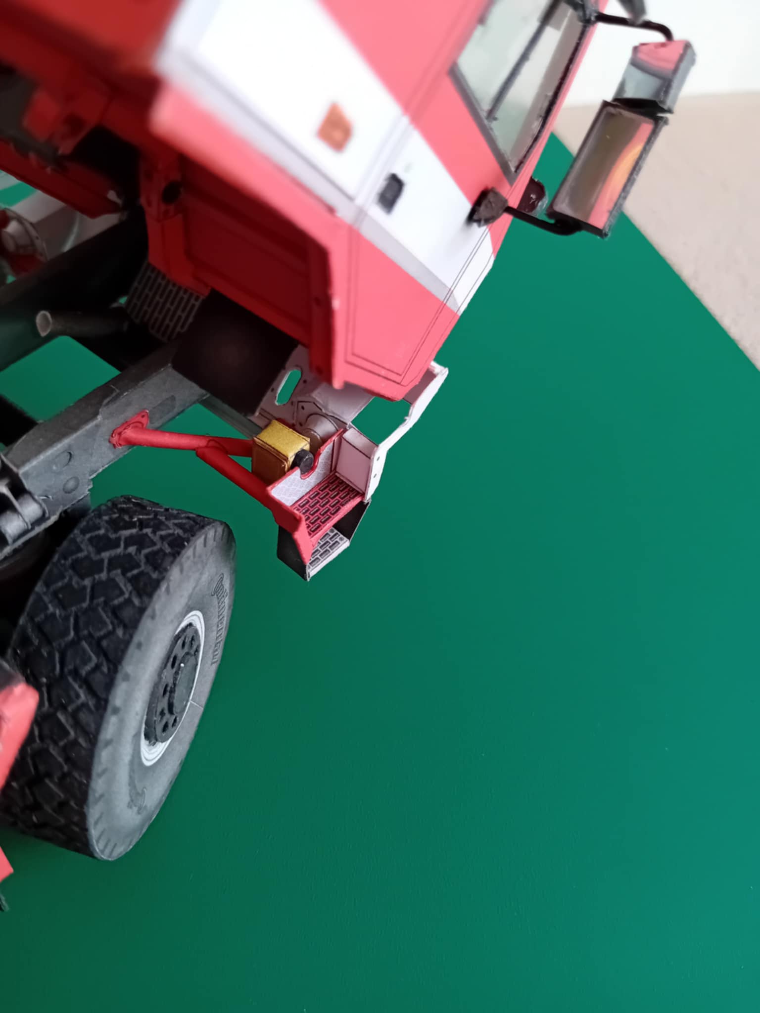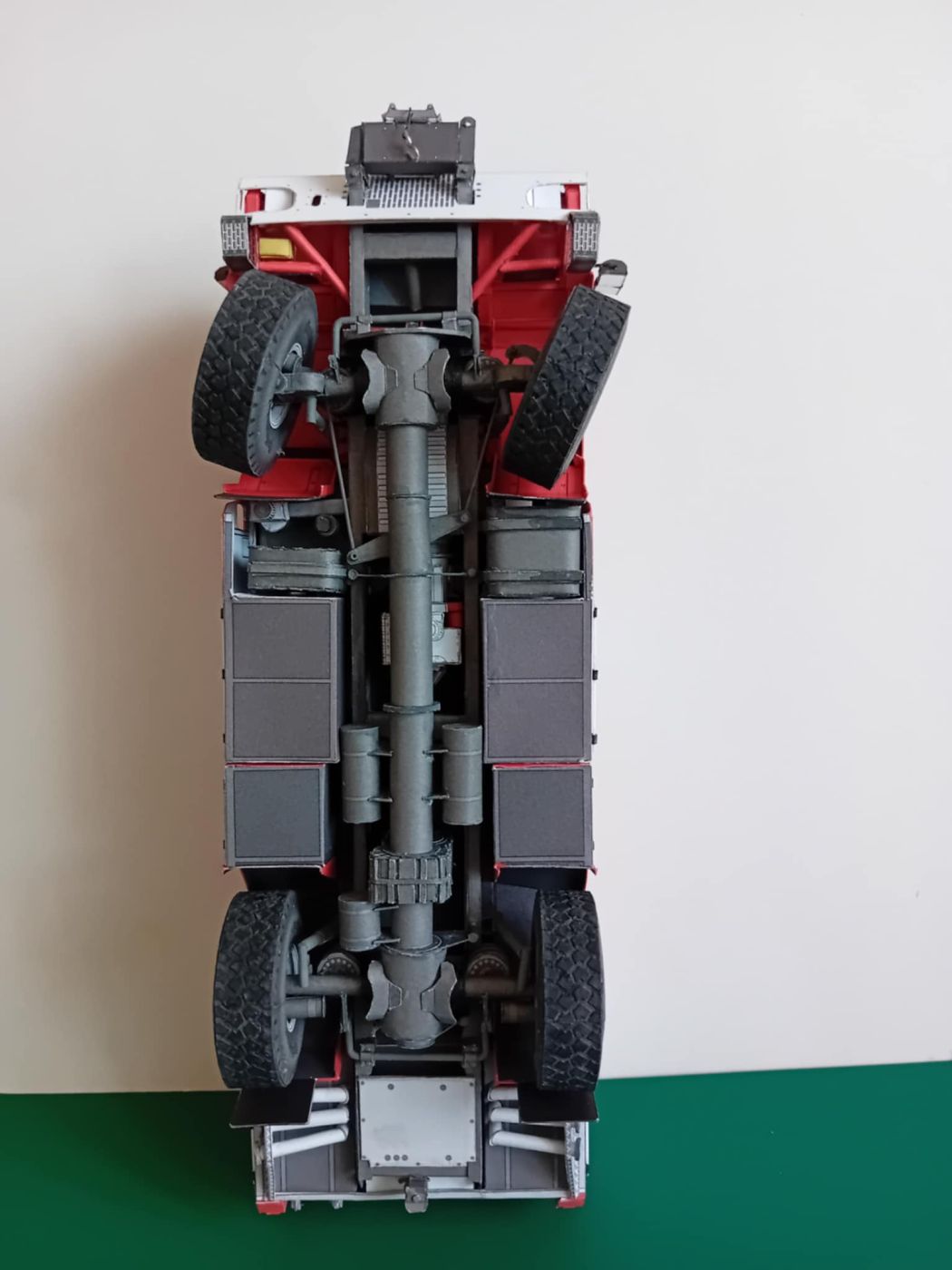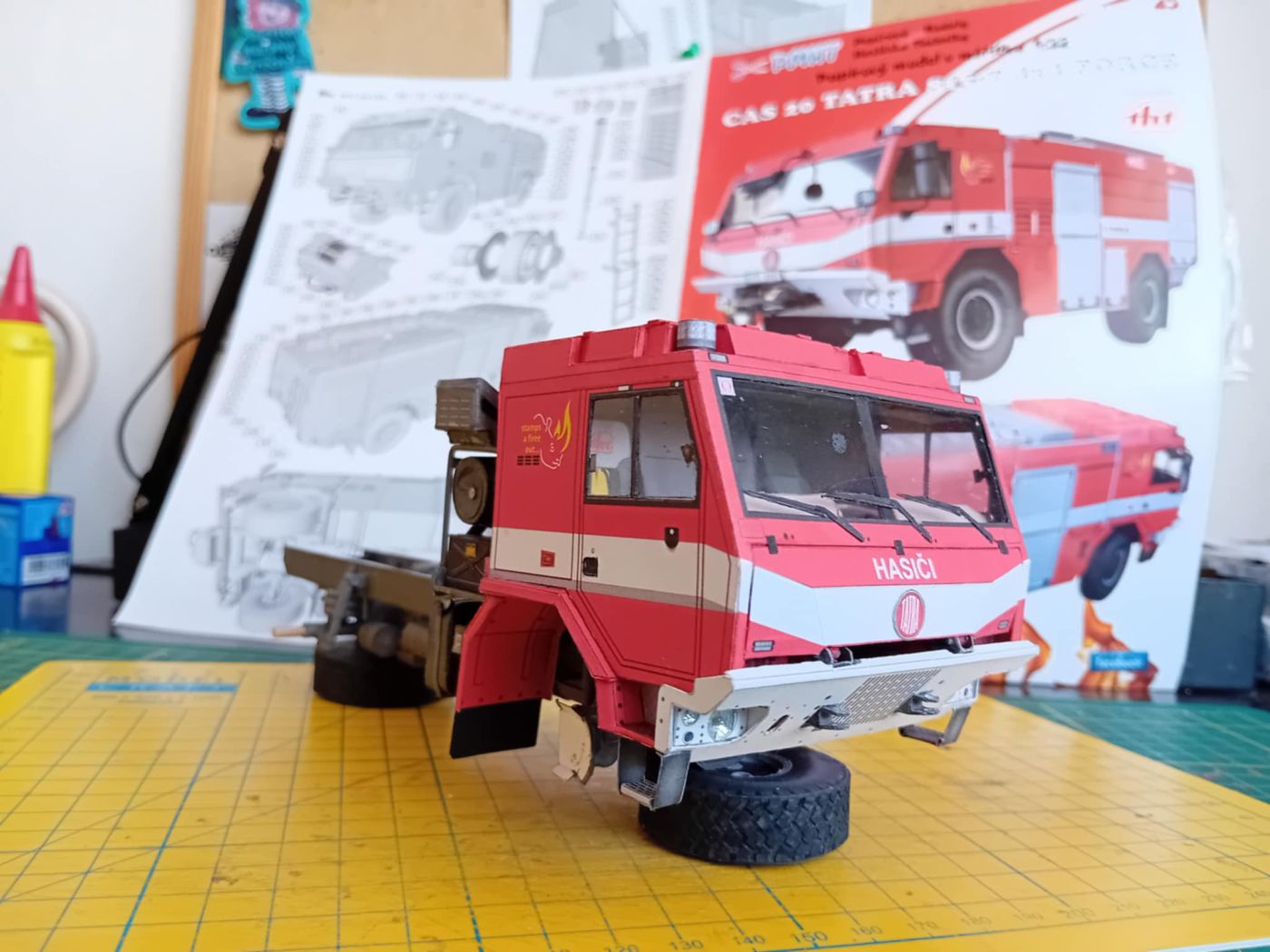 Na rad prišli aj kolesá a Tatra získala tvar. Následovali rôzne drobnosti na kabínu zrkadlá na tie som použil chrómovú pásku, prídavné svetlá. Na prednom diely nadstavby som osadil na pevno potrubia a nalepil svetelnú rampu. Na nárazník ešte prišiel naviják, miesto papierového háka, ten sa mi nepodaril som vyrobil z drôtu.
