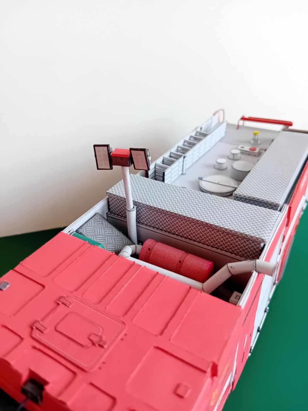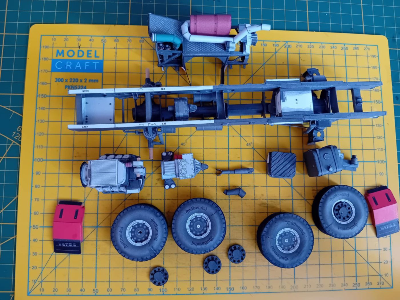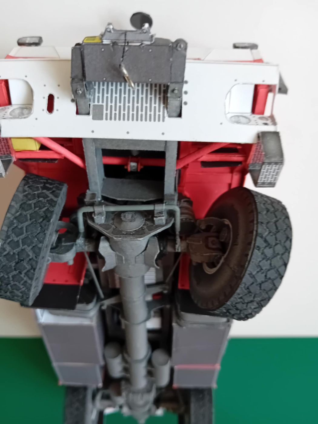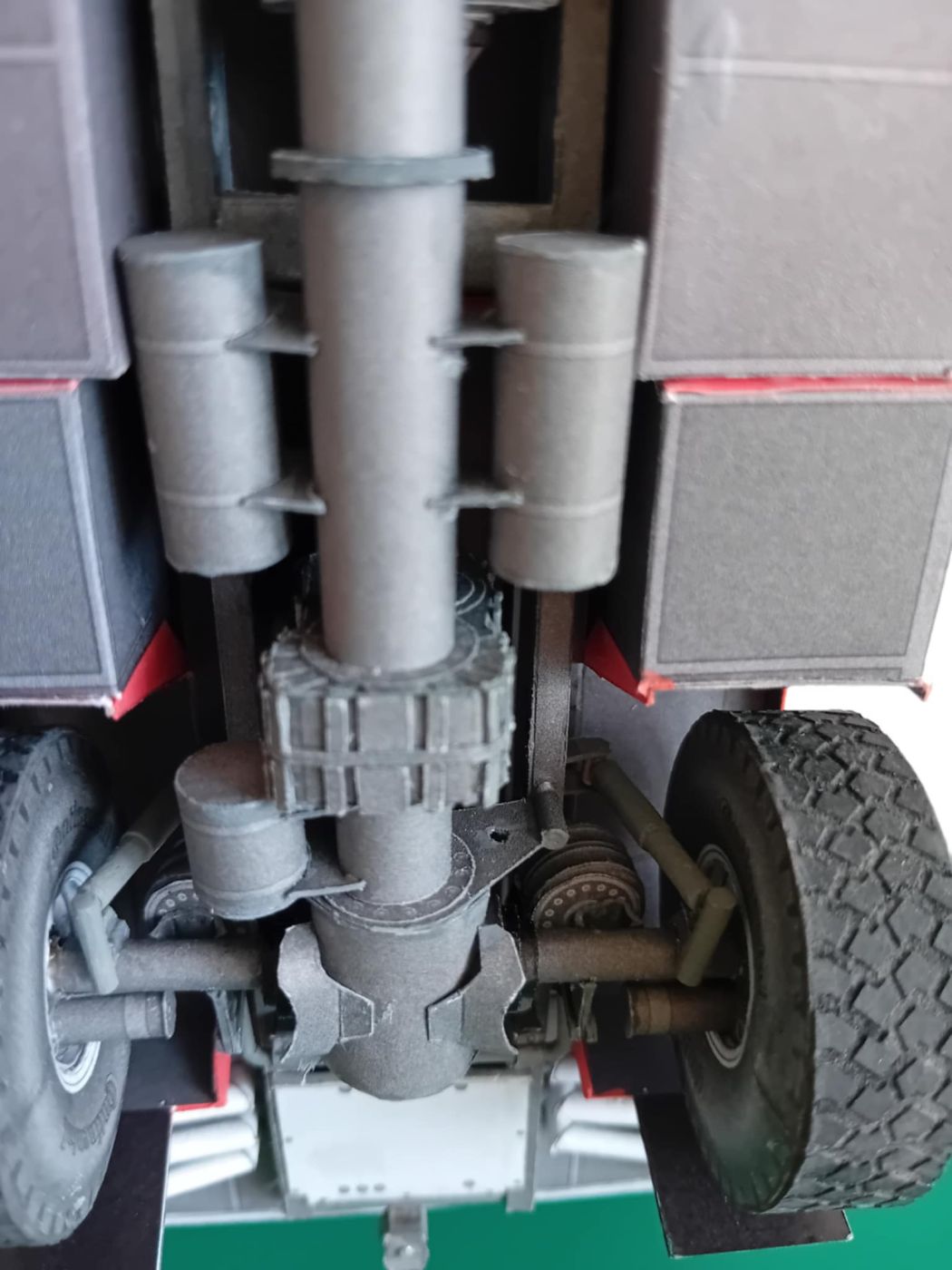 Na rad prišli aj kolesá a Tatra získala tvar. Následovali rôzne drobnosti na kabínu zrkadlá na tie som použil chrómovú pásku, prídavné svetlá. Na prednom diely nadstavby som osadil na pevno potrubia a nalepil svetelnú rampu. Na nárazník ešte prišiel naviják, miesto papierového háka, ten sa mi nepodaril som vyrobil z drôtu.