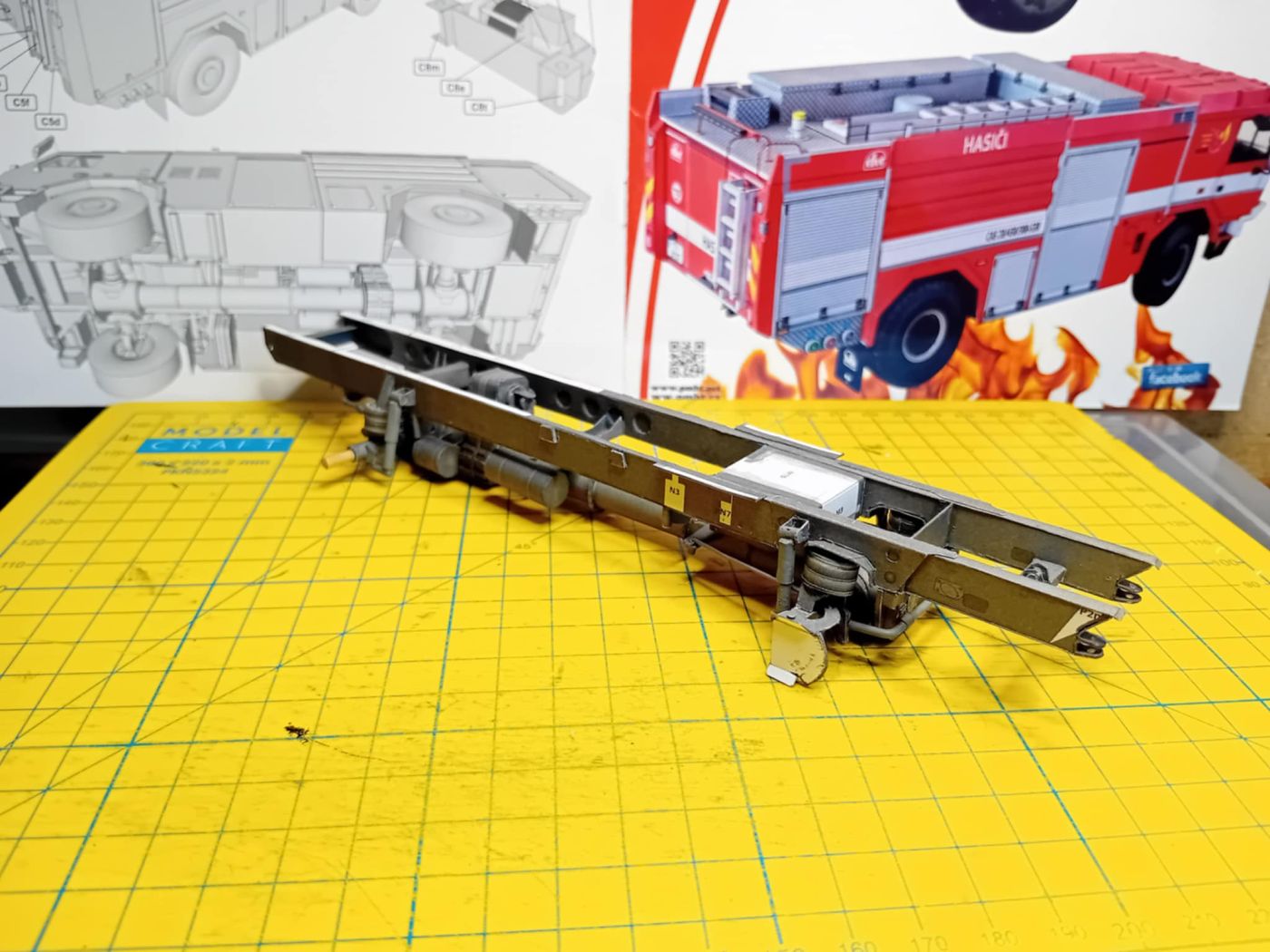 Najpr som prilepil motor s prevodovkou a kardanmi. Osadil kabínu nárazniķ a drobné diely okolo.