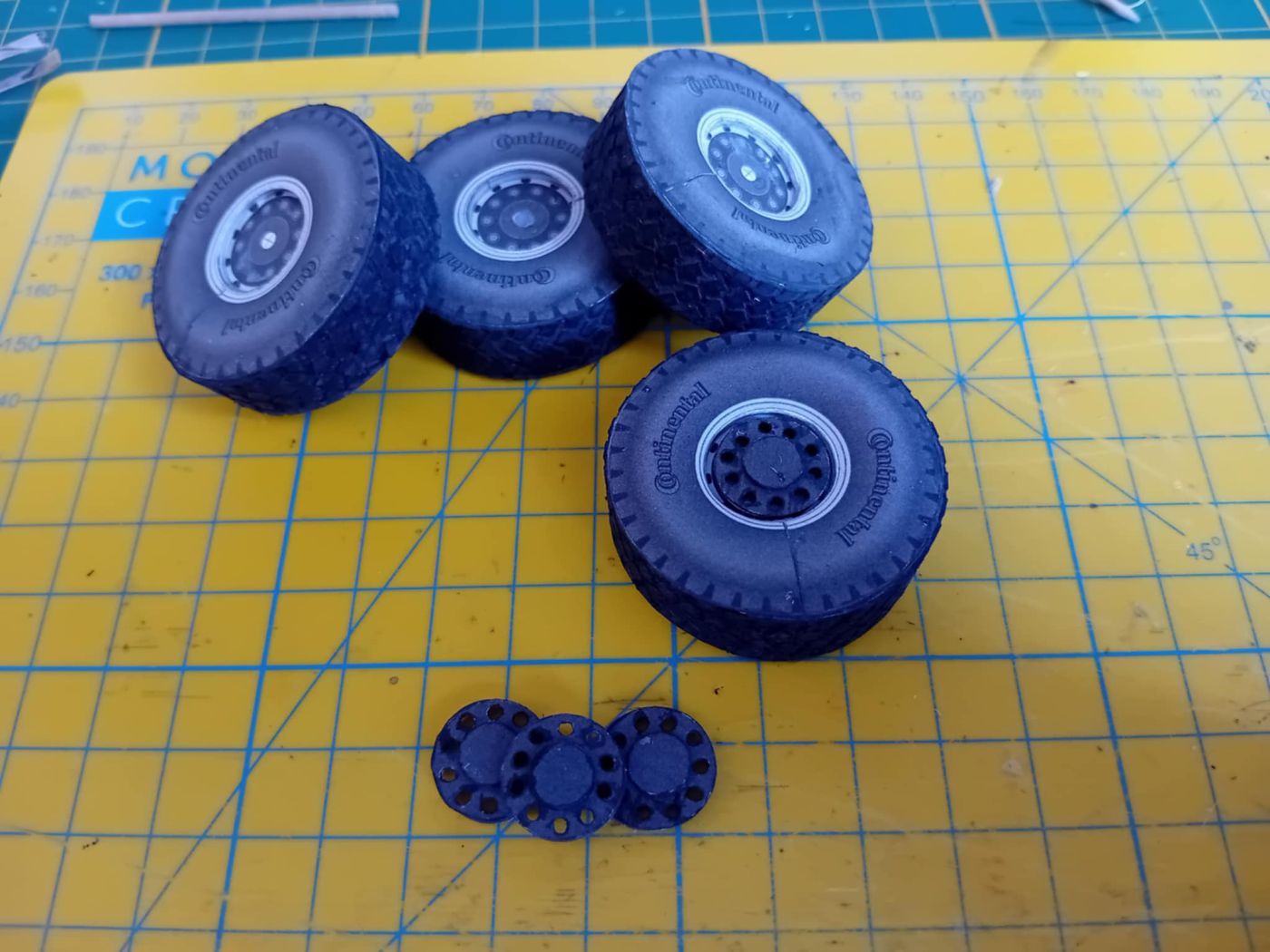Následne so sa pustil do kolies, tu ma prekvapila trocha iná konštrukcia na akú som zvyknutý od Vimos alebo Ripper Works. V pukliciach som vysekal dierky. Dezény som použil o kamaráta lasera 🙂 ten zvyknem pretrieť silne zriedeným herkulesom aby sa nerozpadal, na hotových kolesách so dezén ešte pretrel šedou farbou, aby sa zladil s bočnicami. Kolesá som odložil bokom, tie lepím až v závere stavby.