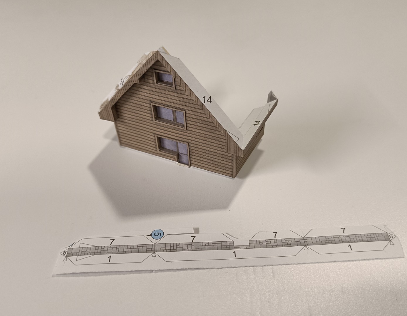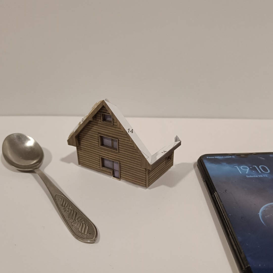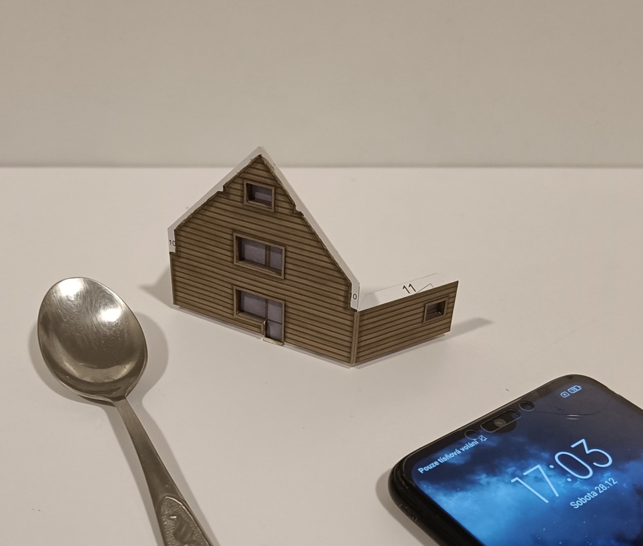 Nejvýše položený, předsazený štít byl jak třešničkou na dortu a hurá na zastřešení domu. Zde bych jen doporučil budoucím stavitelům díl 13 podlepit, nebo alespoň zpevnit v hřebenu. Může se vám totiž, stejně tak jako mi, z důvodu napojení střech prohnout geometrie. Poslední prvek chaty byl komín a model byl ve 22:50 (13 hodin a 59 minut) dokončen.