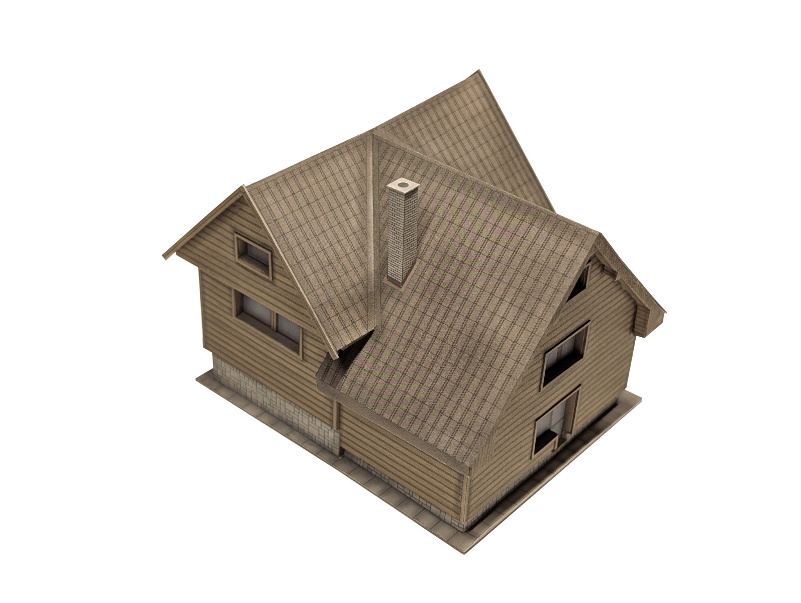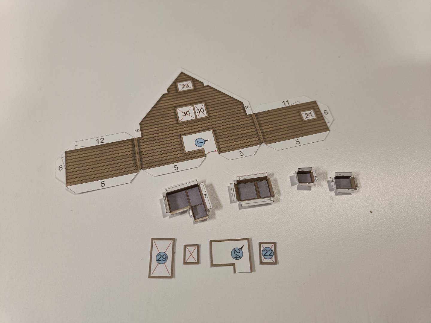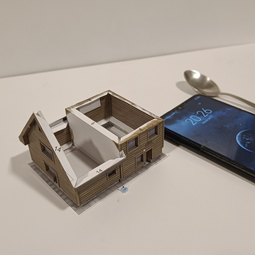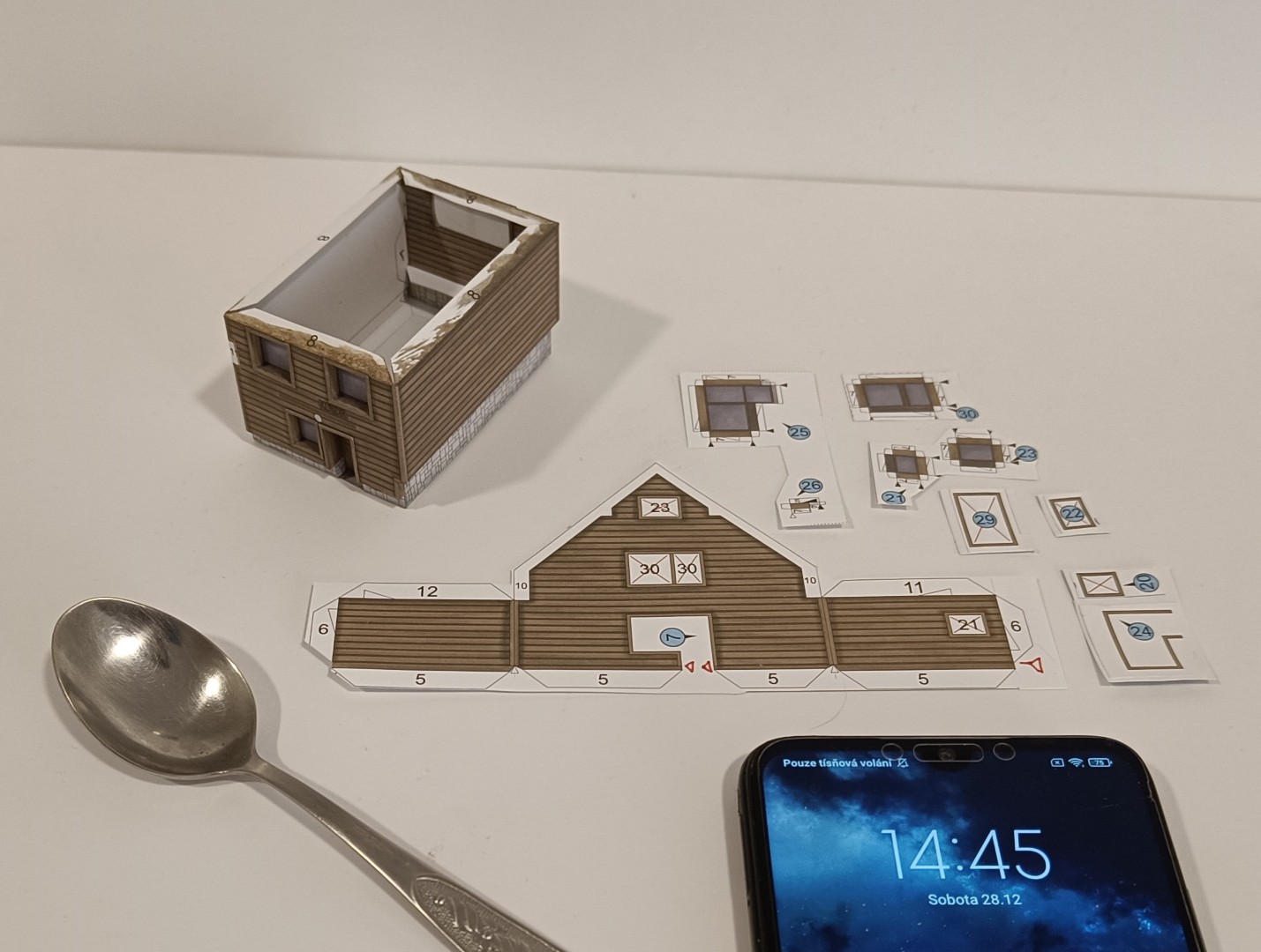 Nejvýše položený, předsazený štít byl jak třešničkou na dortu a hurá na zastřešení domu. Zde bych jen doporučil budoucím stavitelům díl 13 podlepit, nebo alespoň zpevnit v hřebenu. Může se vám totiž, stejně tak jako mi, z důvodu napojení střech prohnout geometrie. Poslední prvek chaty byl komín a model byl ve 22:50 (13 hodin a 59 minut) dokončen.