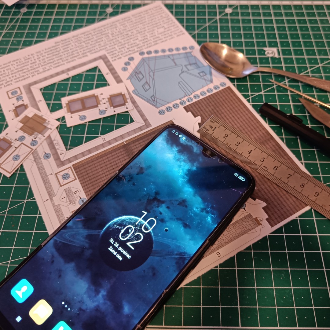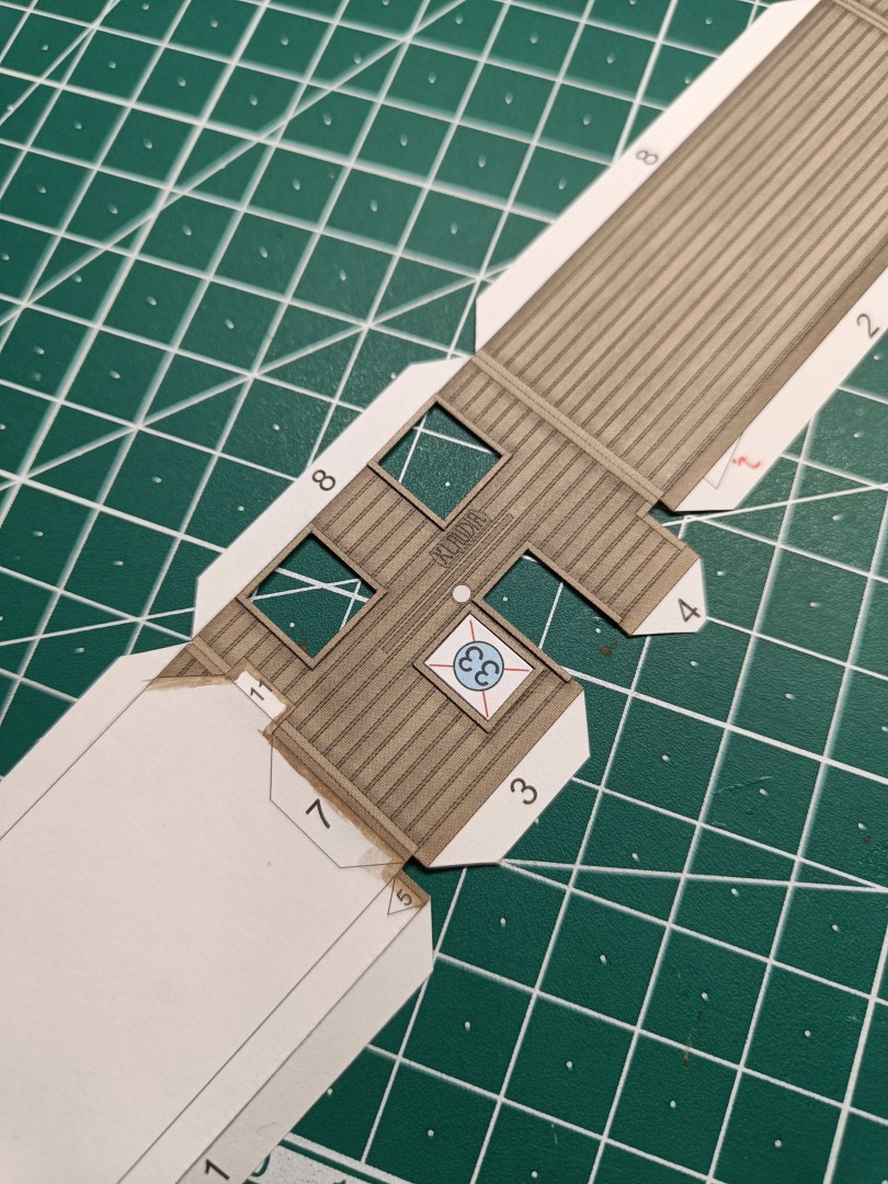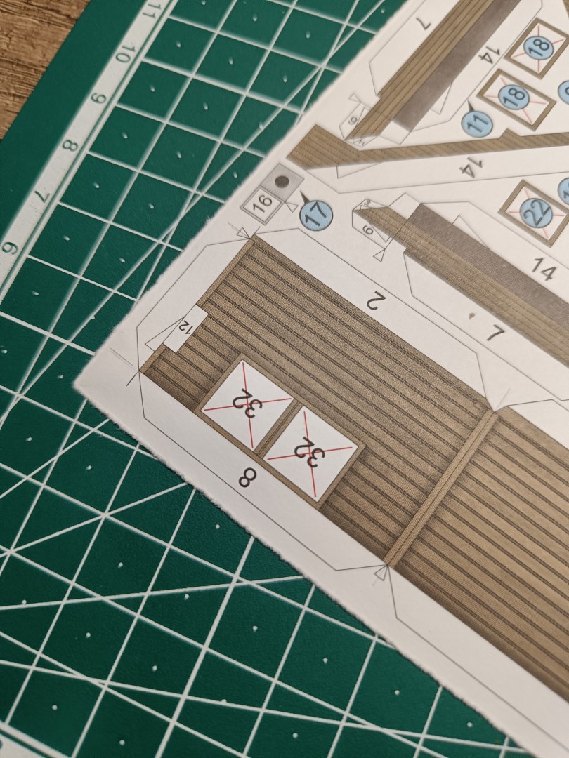 Prezentaci stavby jsem zahájil, stejně jako ostatní, uveřejněním fotografie obálky vystřihovánky, s časem 8:51. Díly jsem od toho času začal rýhovat, jak je u mne běžné, z rubu. Tuto metodu jsem si oblíbil pro nenarušení potištěné strany dílů.