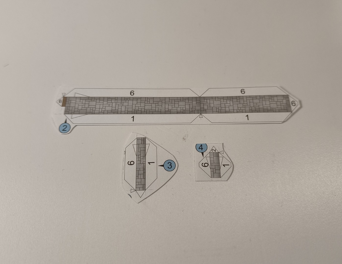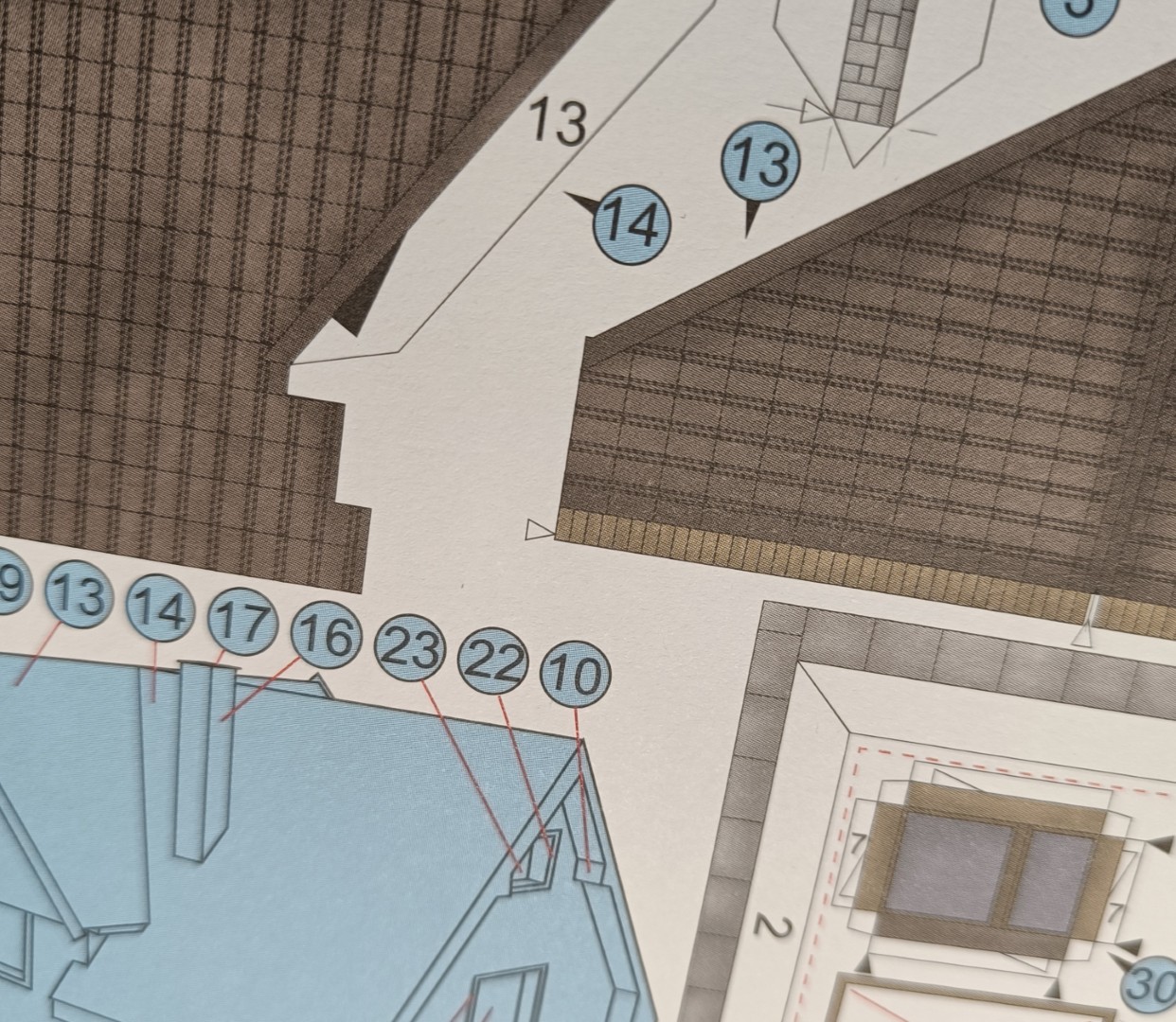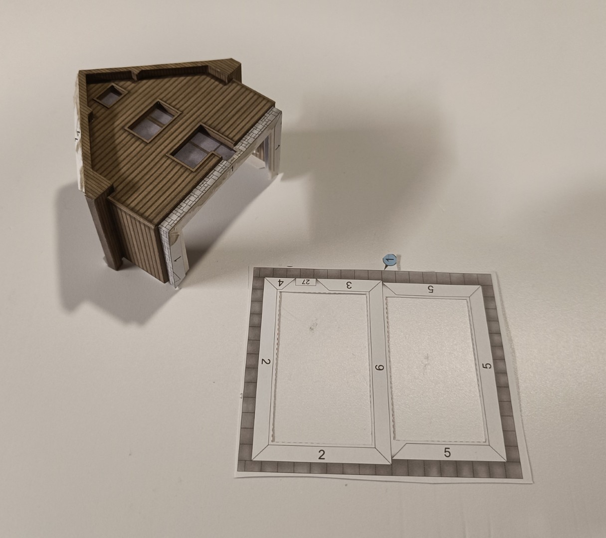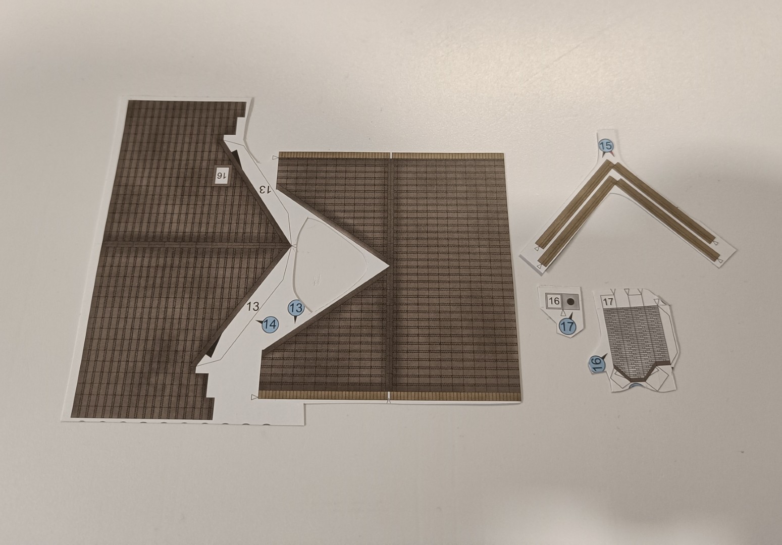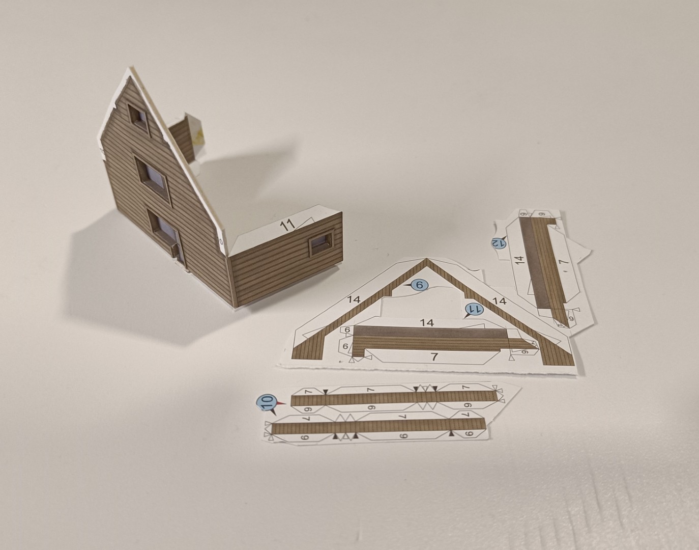 Nejobtížnějším na stavbu a udržení geometrie bylo určitě opláštění krovu před štíty, díly 9-10, které se pak lepilo přímo na štít. Zpětně si říkám, zda-li by nebylo snazší uříznout přilepovací plochy štítu 7 a lepit to z rubu. Dalším krokem bylo připojit sokly a stěny uzavřít.