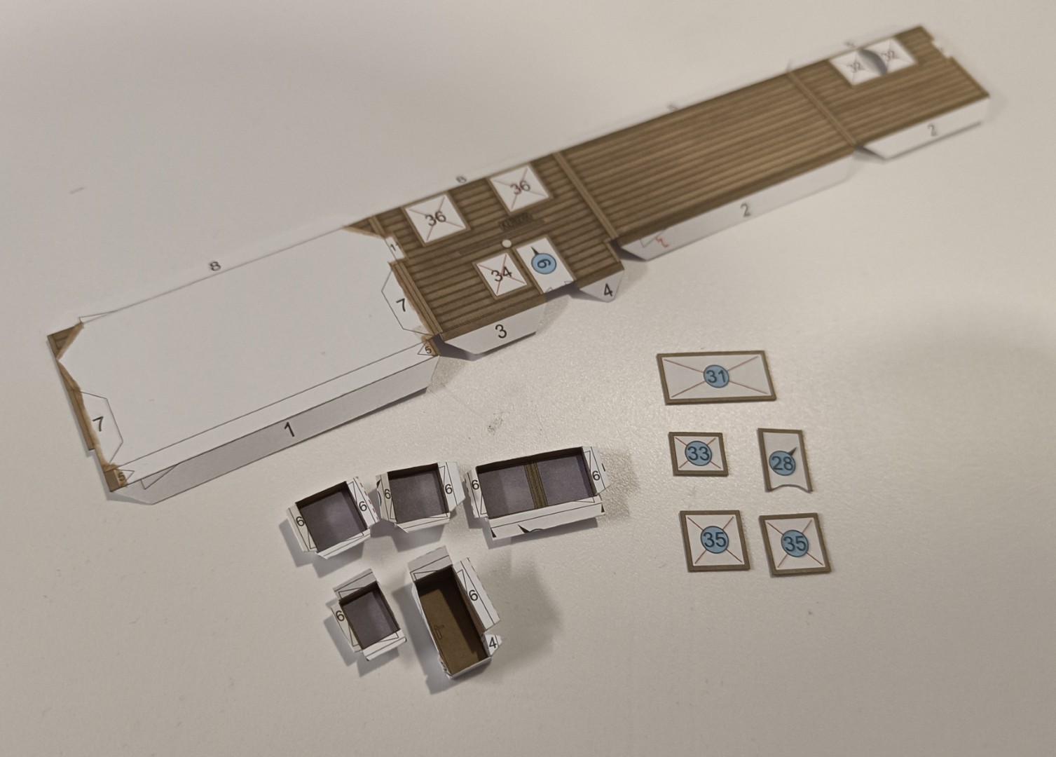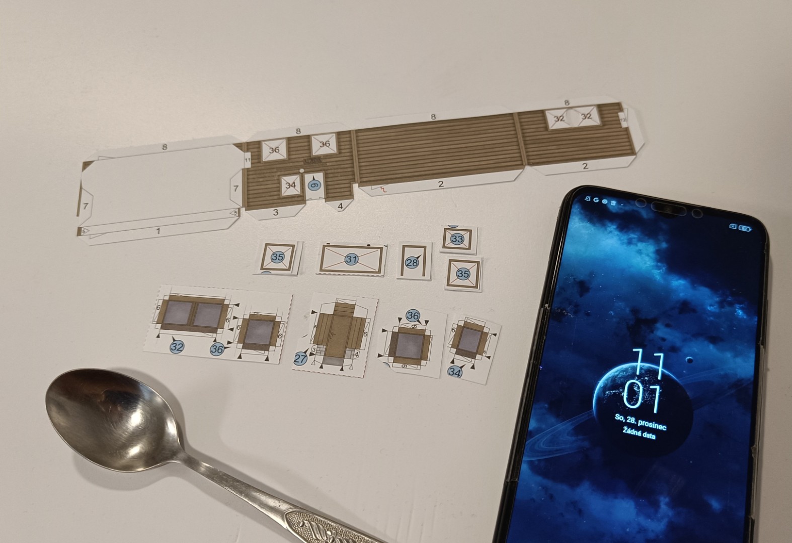 Ubyly téměř další dvě hodiny, ale posun stavby tomu neodpovídal. Možná to bylo mým způsobem stavby, možná jsem měl před lepením tisk alespoň trochu zalakovat, ale v místě hran a ohybů se papír začal malinko třepit a bylo mnohdy nutné některá místa přeretušovat.