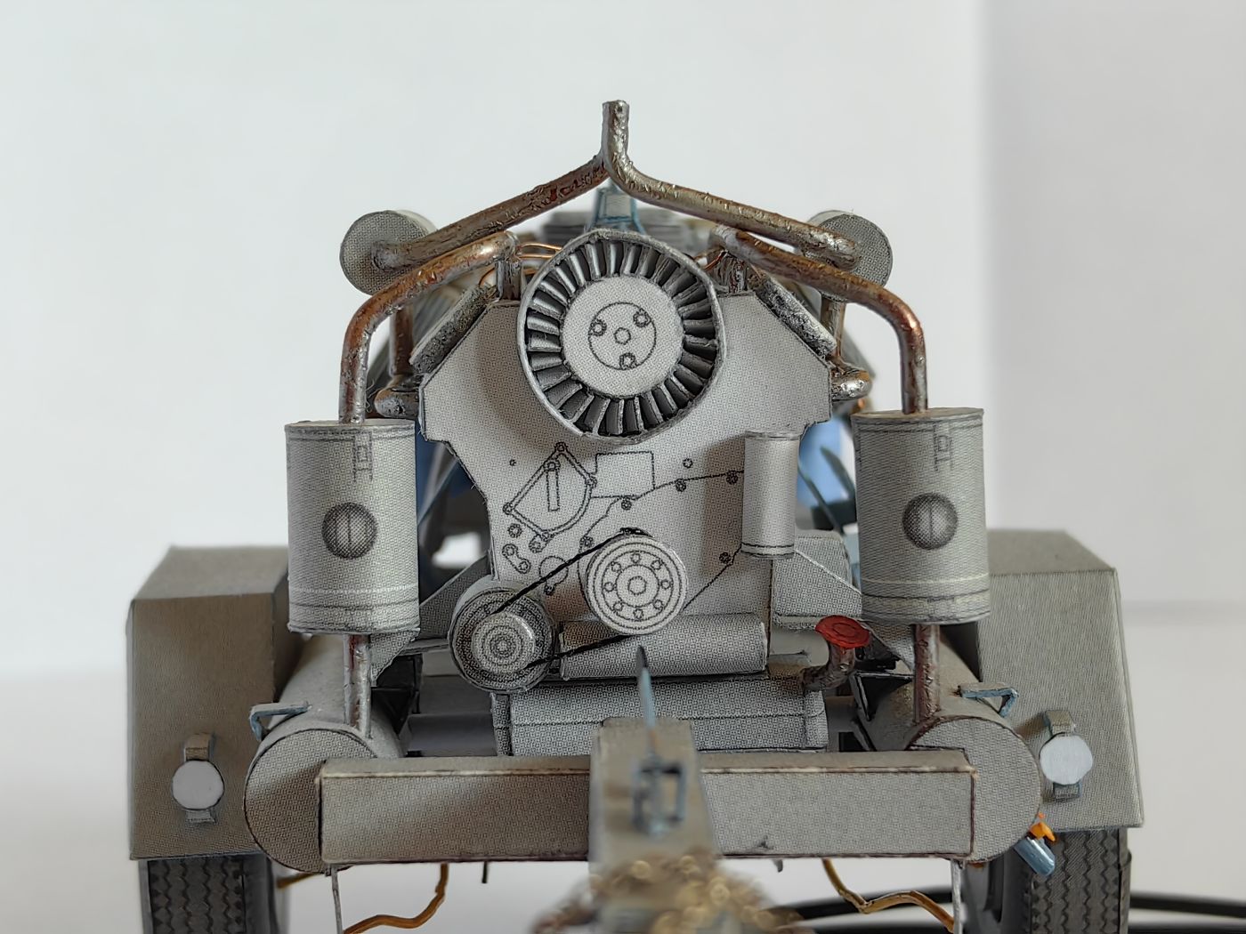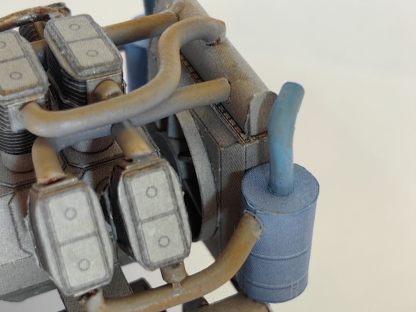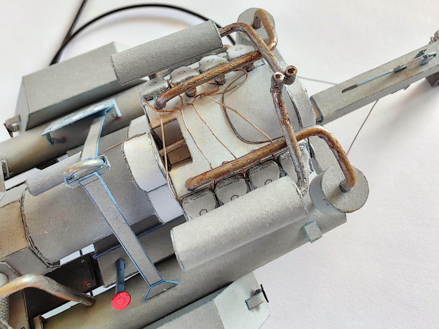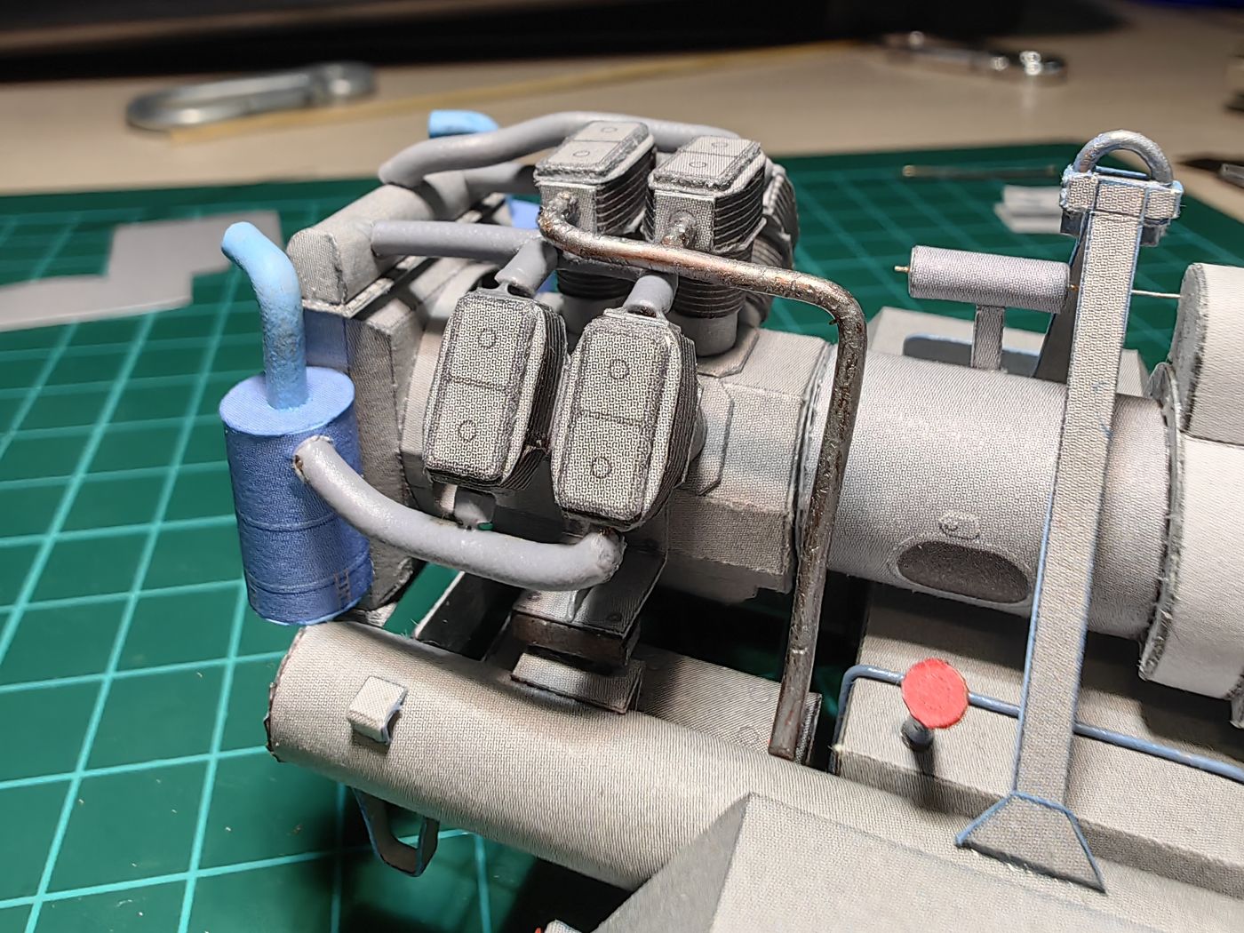 Motor je celkom jednoduchý, napriek výberu možnosti jednoduchého / zložitého ventilátora chladenia. Taká drobnosť, chýba mi tu naznačenie vstrekovacieho čerpadla, ale to je detail. Podľa obrázkov som si popridával aspoň približne vstrekovacie hadice z drôtov ku krytom ventilov.