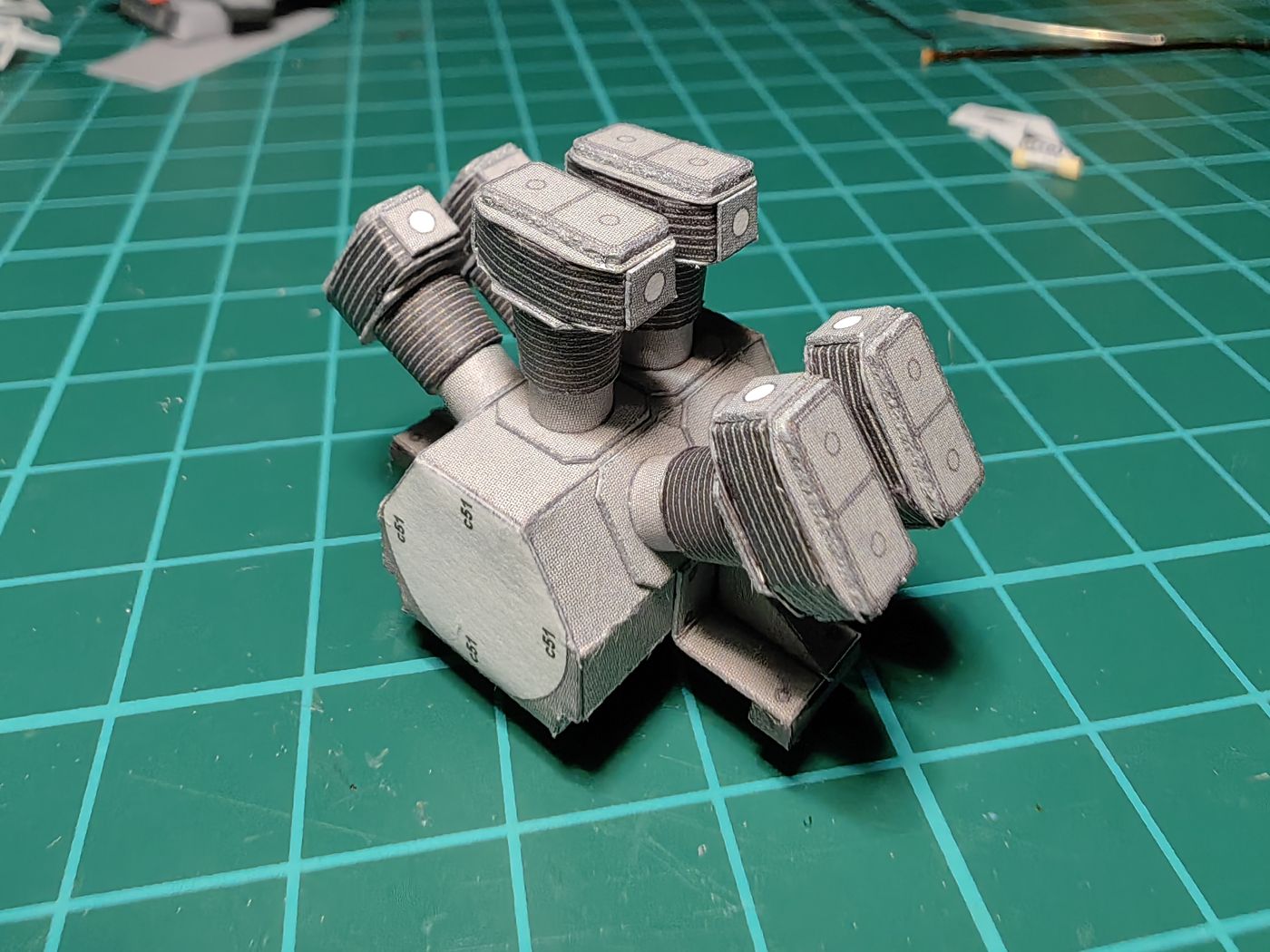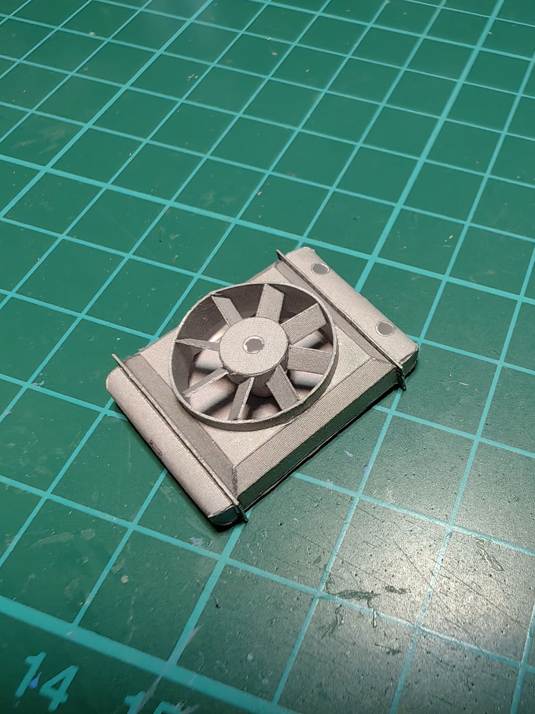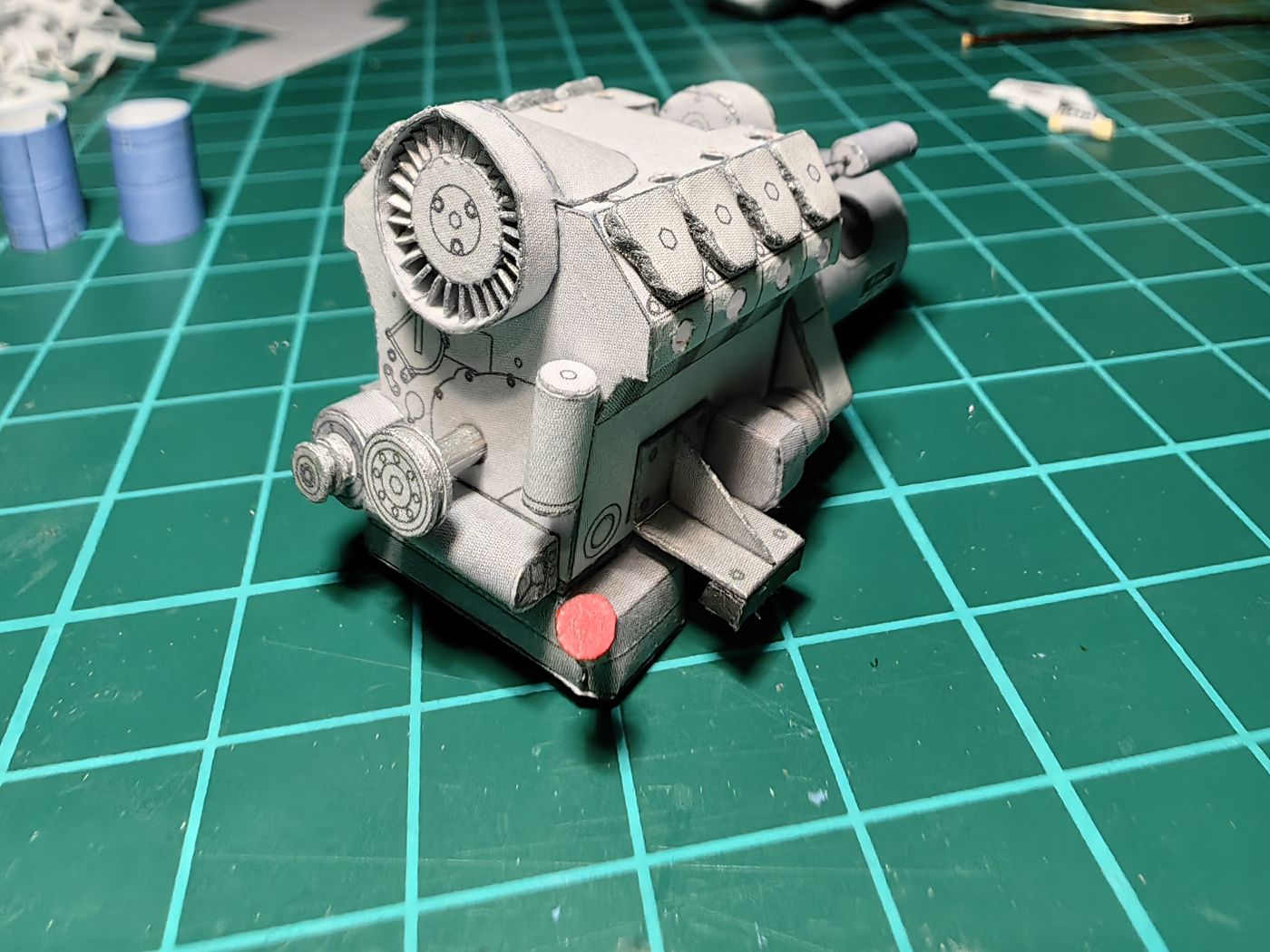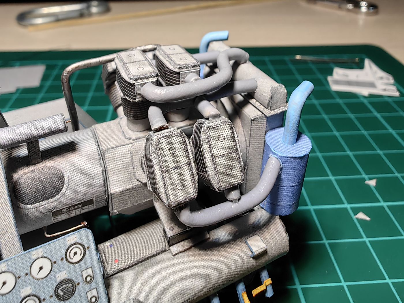 Motor je celkom jednoduchý, napriek výberu možnosti jednoduchého / zložitého ventilátora chladenia. Taká drobnosť, chýba mi tu naznačenie vstrekovacieho čerpadla, ale to je detail. Podľa obrázkov som si popridával aspoň približne vstrekovacie hadice z drôtov ku krytom ventilov.