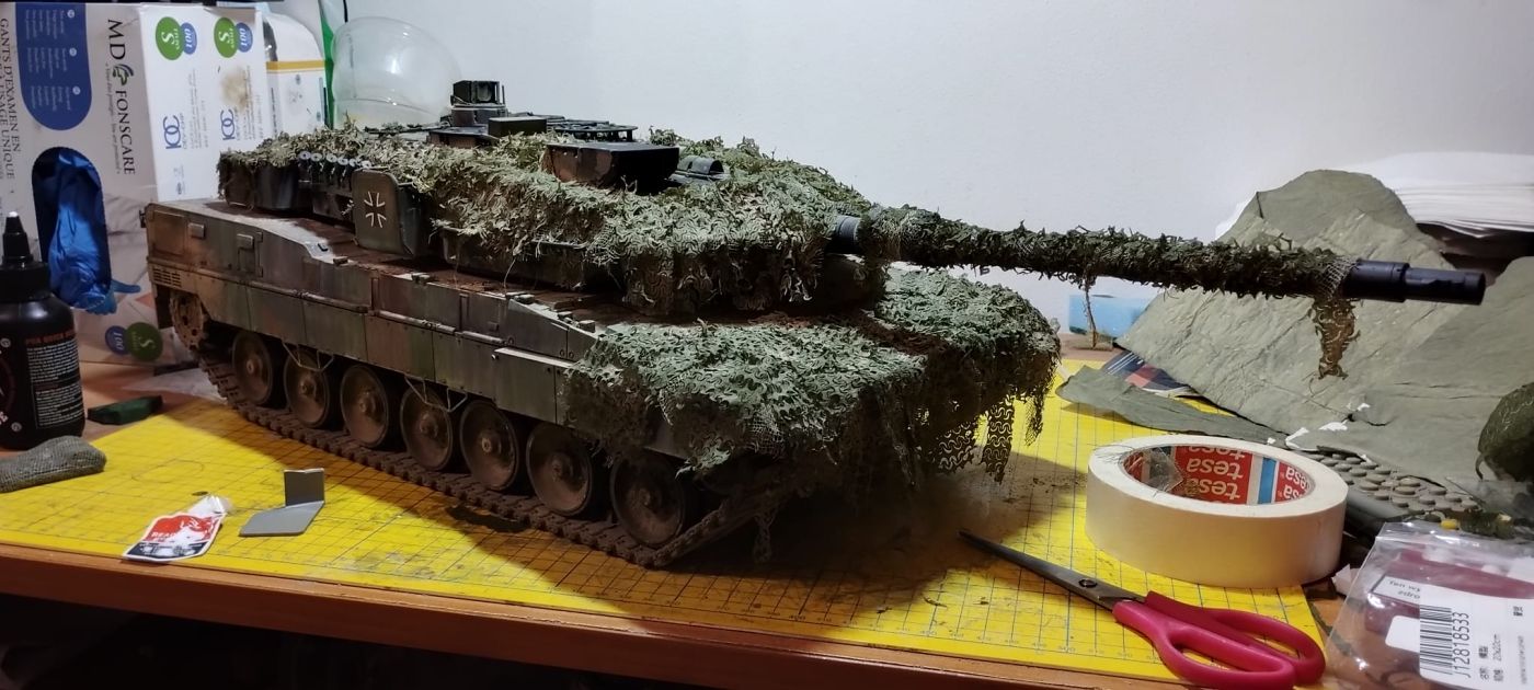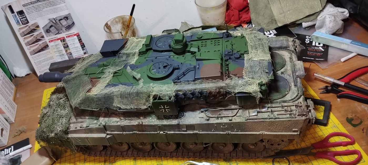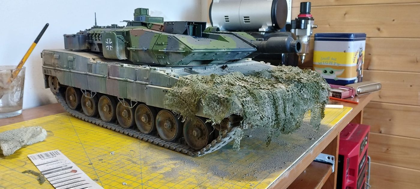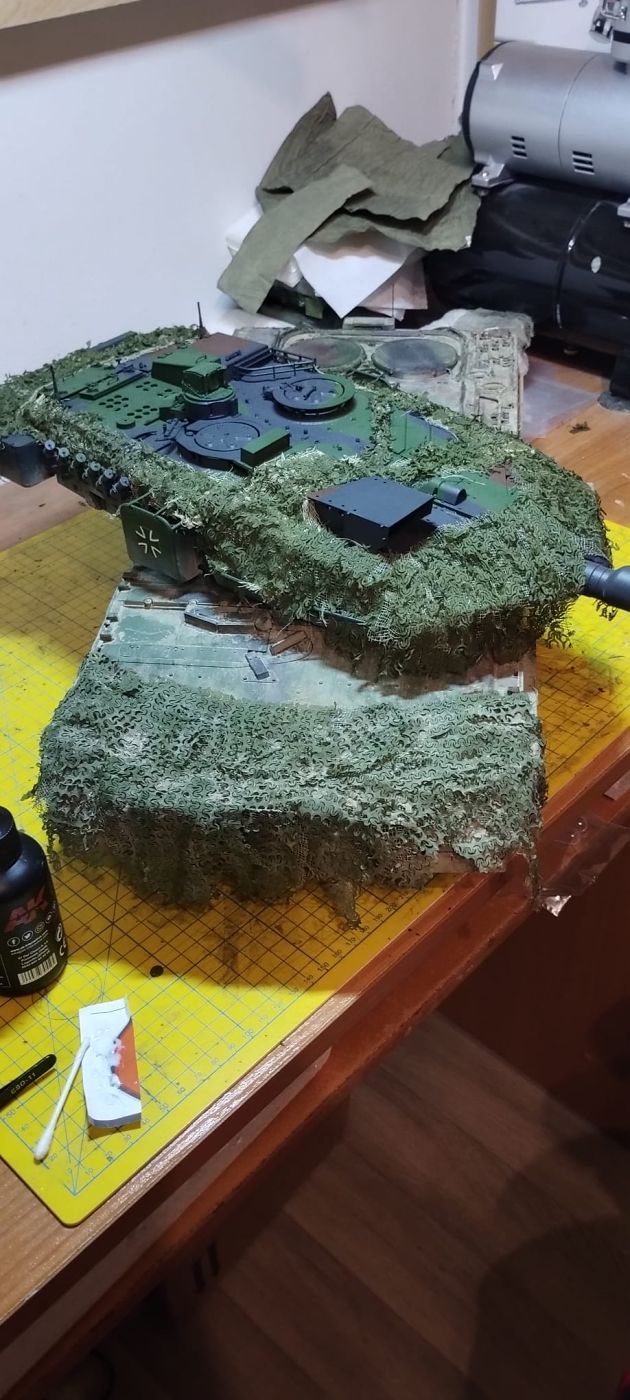 Další věcí, která se mi líbila, bylo použití maskovací sítě. Jako podklad byl použit lékařský fáč, který jsem v kombinaci s lepidlem od AK a barvy, namočil do kelímku s barvou, vytáhl a nechal zaschnout. Pak se dolepila síť, a celé se to dodělalo suchým pigmentem.