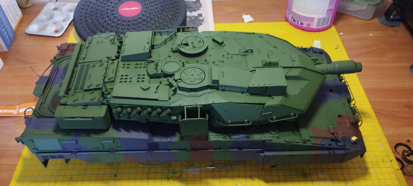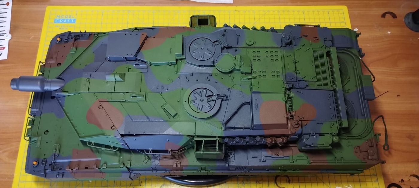 Zakoupil jsem sadu AK Real Colours NATO + jednu NATO green do zásoby, jelikož základní barva pro celý povrch byla právě zelená. Odstín barev seděl perfektně. Po nastříkání jsem celý model zalakoval polomatným lakem Mr.Paint. Na kamufláž jsem používal AK Elastic Putty modelářskou plastelínu, která ačkoli je velmi dobrá, tak někdy mi to podfouklo. Nicméně nic hrozného, protože tank měl být stejně zašpiněný a schová se to.