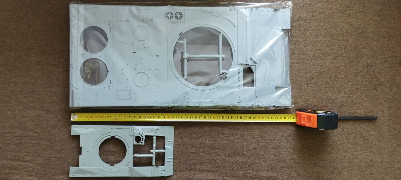 Už po otevření krabice na nás vykoukne impozantní korba tanku. (délka: 470mm!) Já, co stavím techniku v měřítku 1:35 jsem byl doslova vykulený. Dále je tam spousta rámečků s díly, lepty, lana, obtisky a návod.