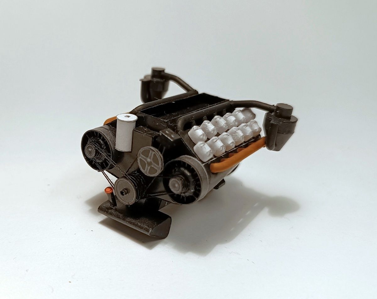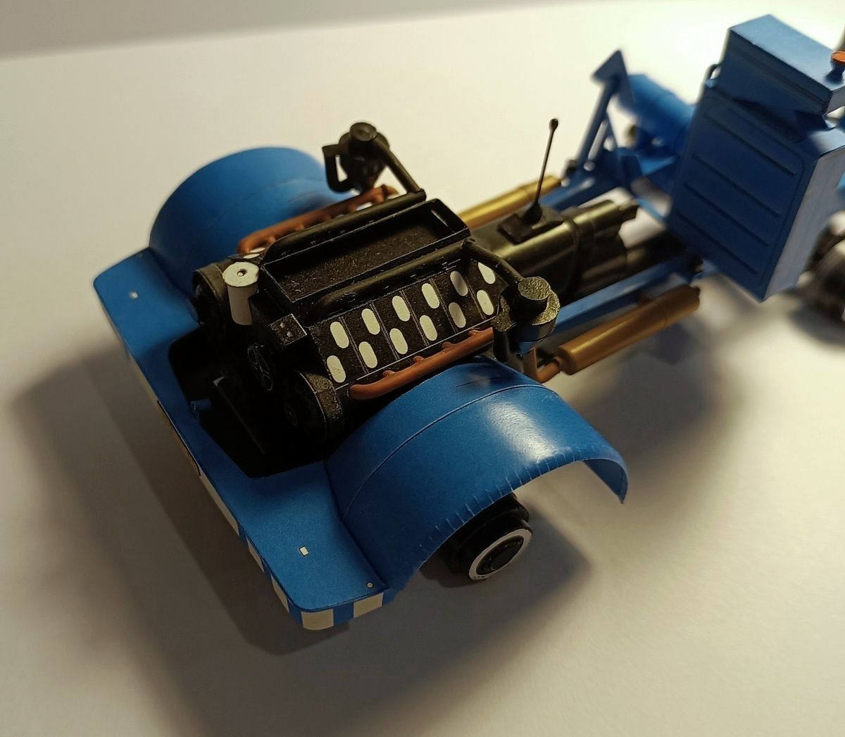 Výrazný prvok modelu sú aj zaoblené blatníky a kapota. Kto má odvahu môže skúsiť vyrezať aj bočné prúdiče vzduchu, ale mne sa do toho nechcelo. Kapotu som doplnil opäť o laserový doplnok (mriežku) a tak aj pri zavretej kapote vidíte časť motora.