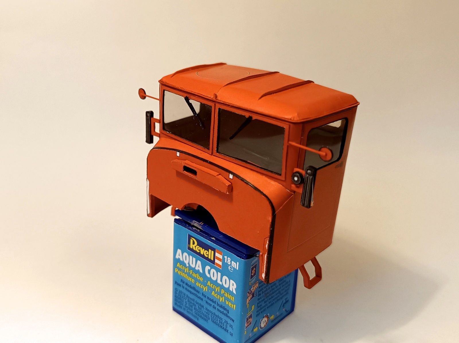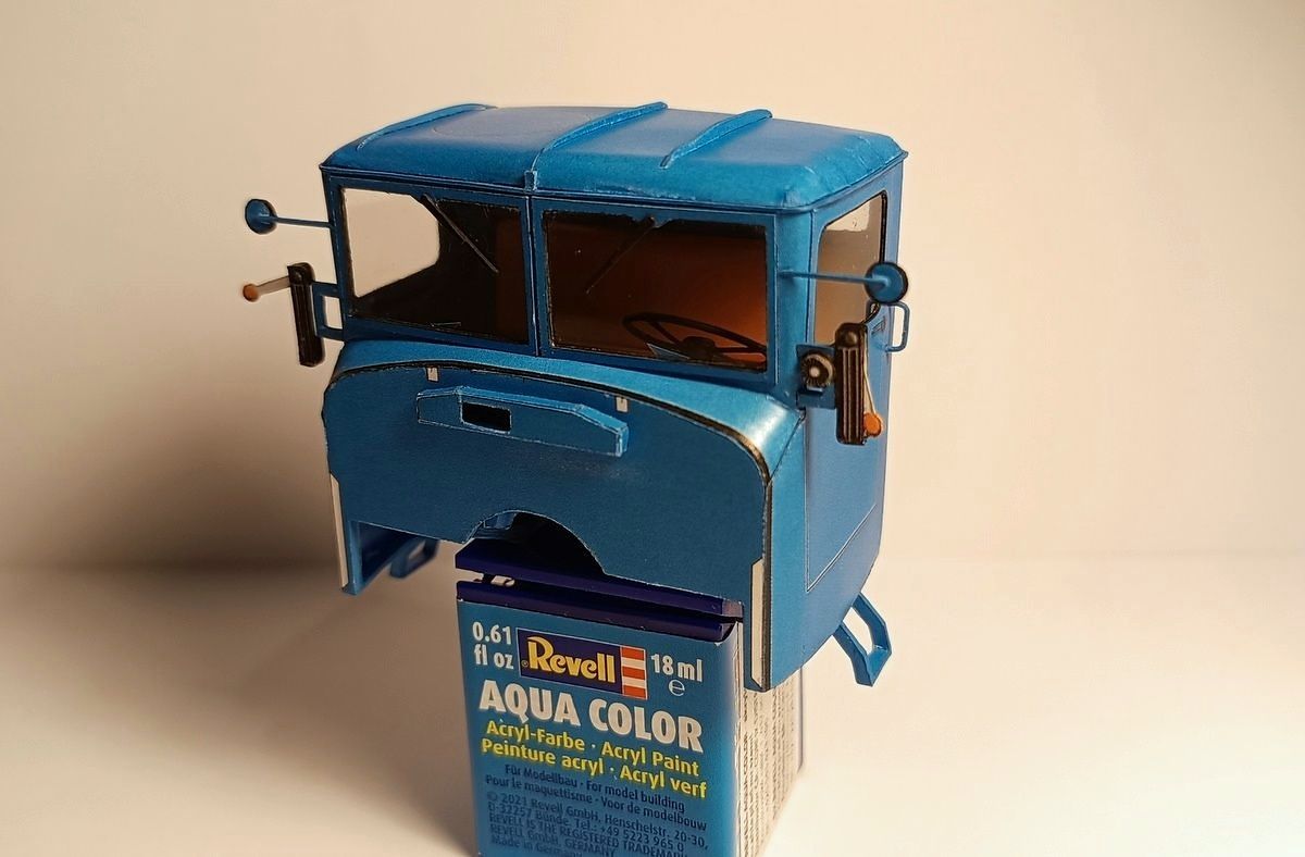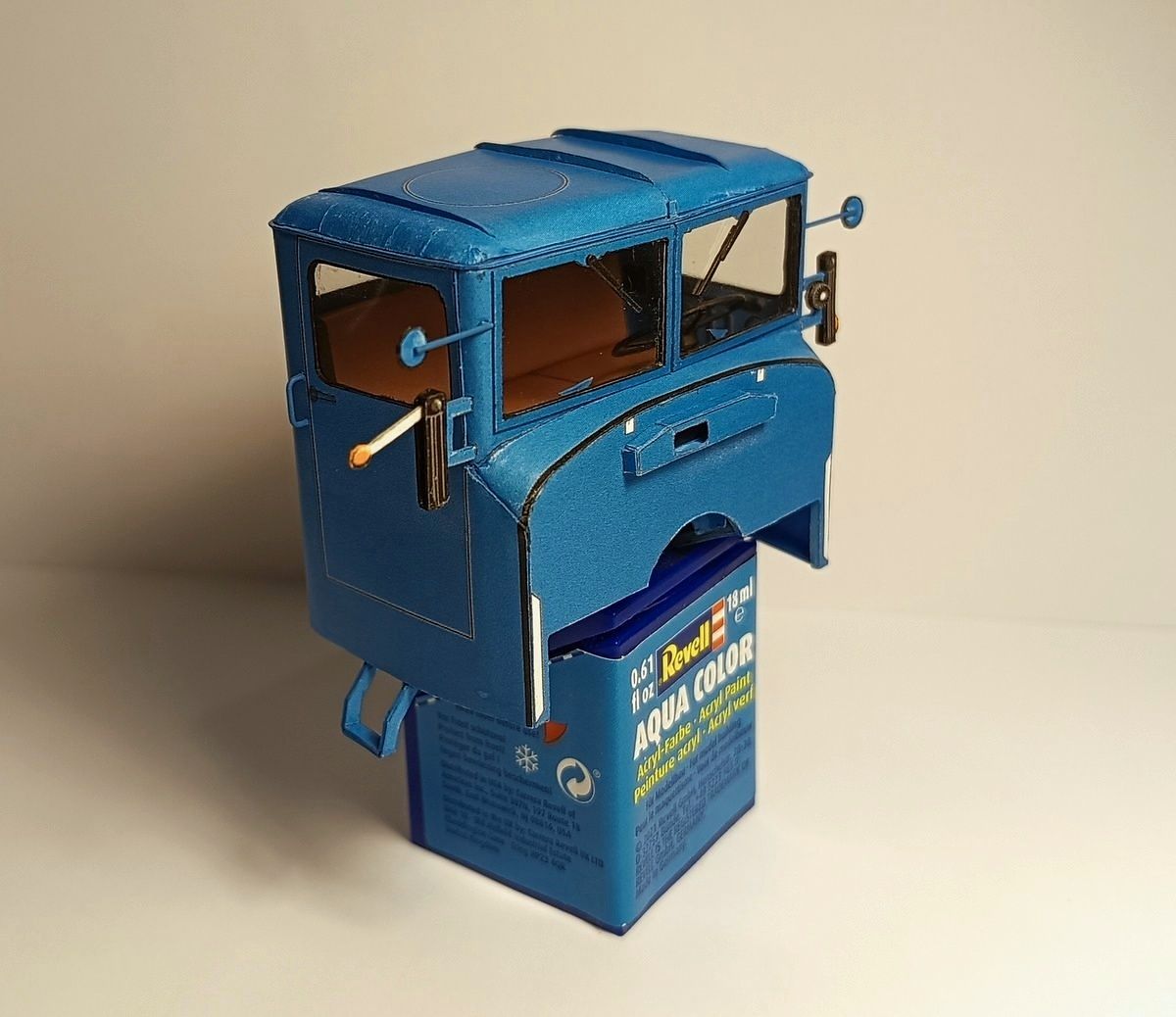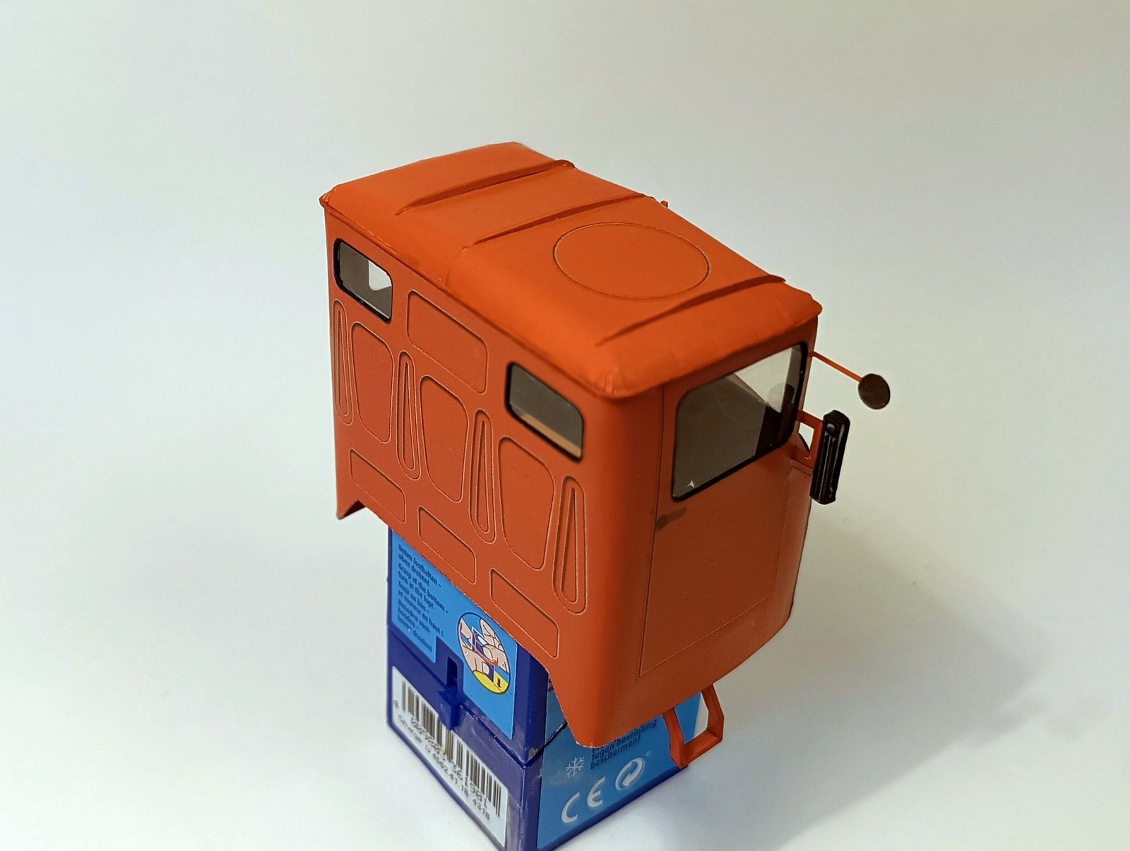 Ďalej stavba pokračovala kabínou. Interiér je pomerne jednoduchý v tej dobe tam toho ešte veľa nebolo. Rovnako tak zasklenie je jednoduché, keďže sklá sú rovné. Konštrukcia kabíny je napríklad v porovnaní s kabínou V3S jednoduchá. Trochu trpezlivosti a výsledok stojí za to.