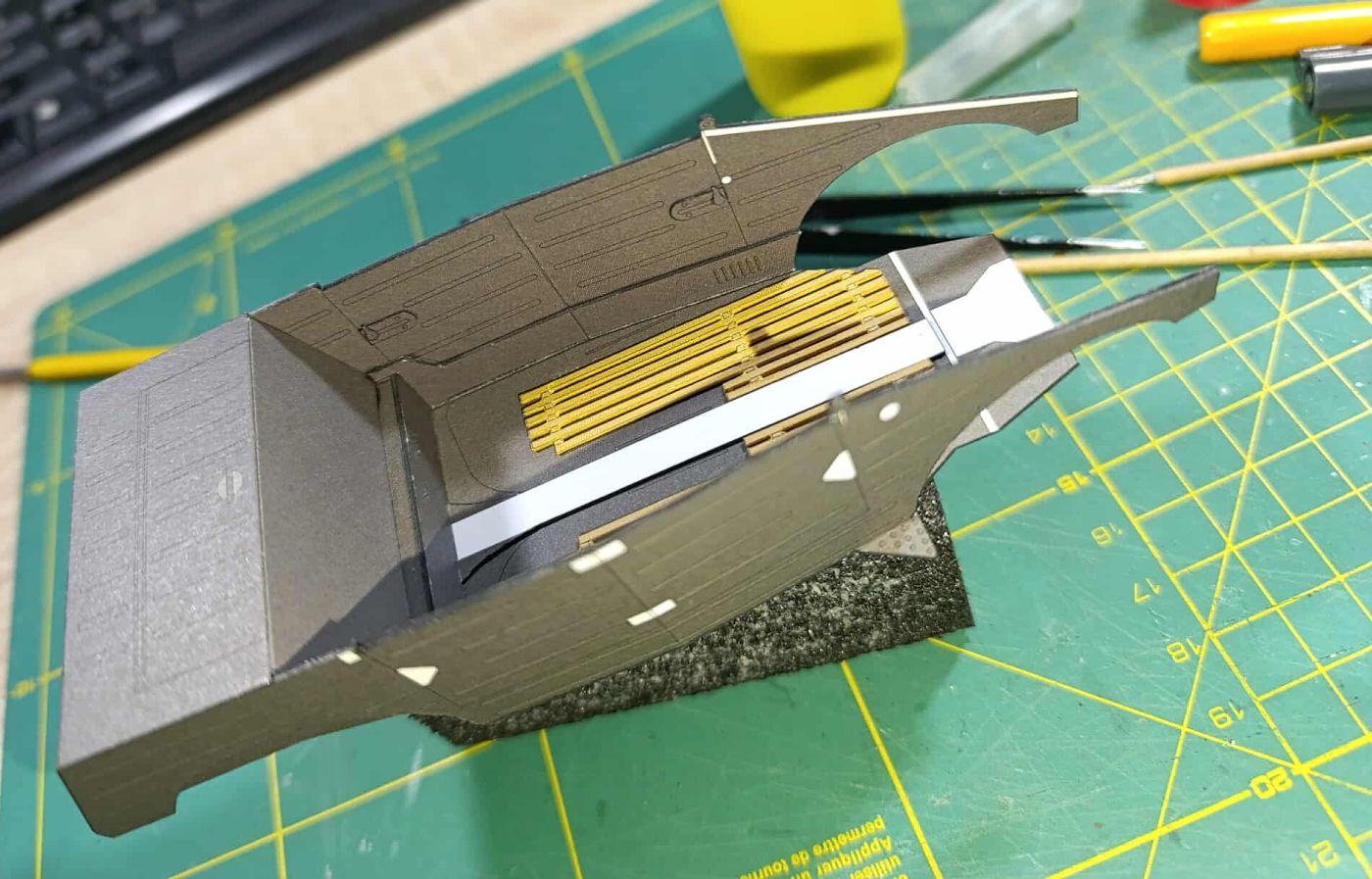 Samotné sedačky sú tvorené základnou konštrukciou, ktorá pozostáva len z jedného dielu, sedák a operadlo sú podlepené a vystrihnuté z 2mm kartónu. Dvere vozidla nie sú konštruované na otváranie, ale oceňujem pekný detail modelu – naznačené pánty a kľučky na dverách.