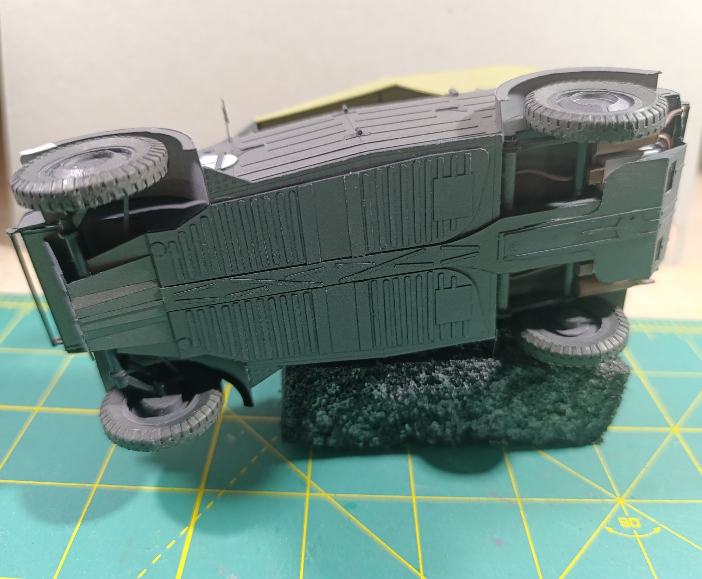 Na koniec zostalo už len nalepiť spätné zrkadlá svetlá rezervu na prednú kapotu a vyrobiť drevenú rúčku na lopatu.