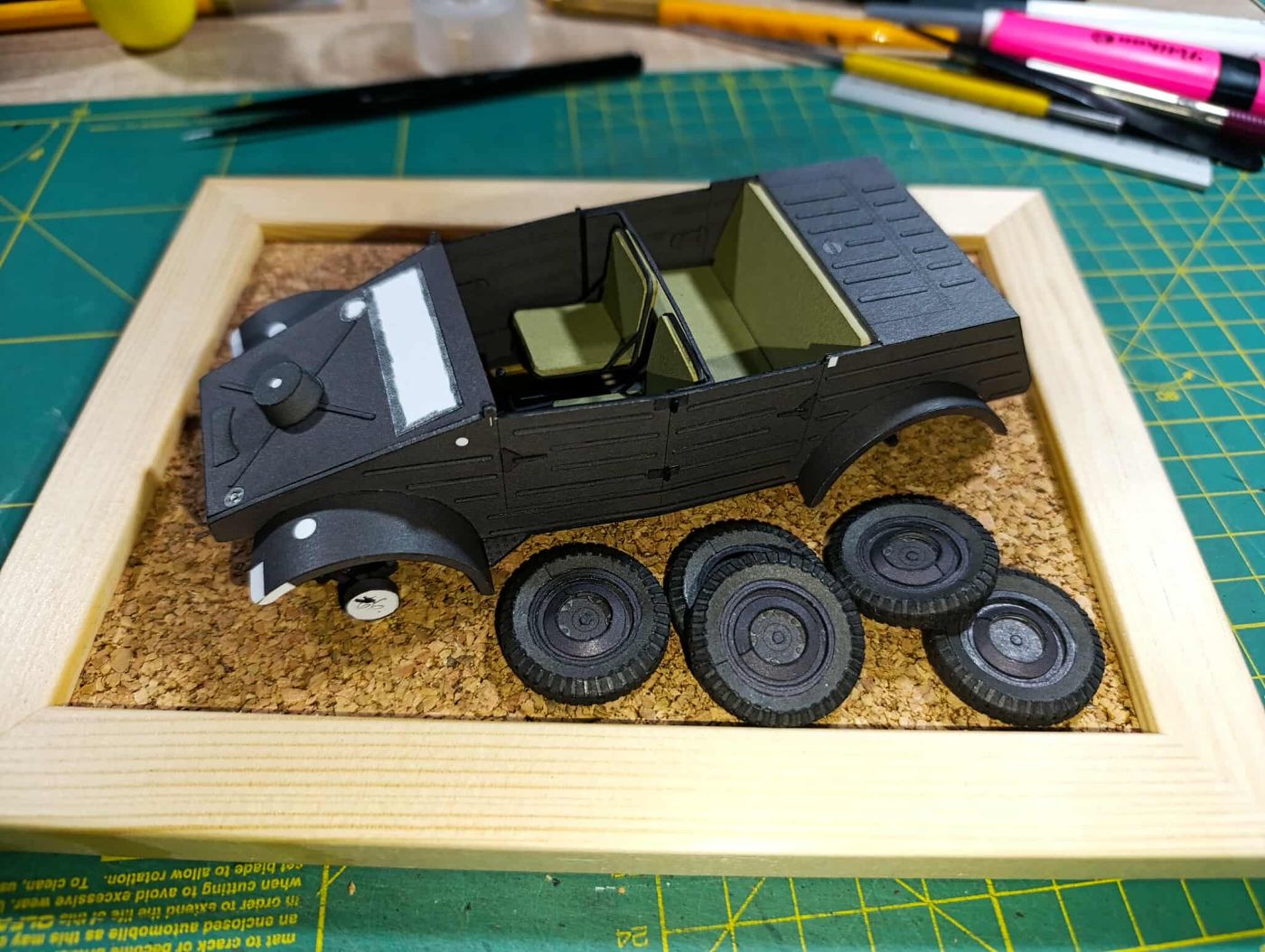 Rám kolies sa skladá z viacerých podlepených dielov na kartóne 0,5mm, ktoré spoločne vytvárajú pevný základ. Pri ich kompletácii nevznikol žiadny vážny problém. Kolesá na modeli sú napevno prilepené a neotáčajú sa.